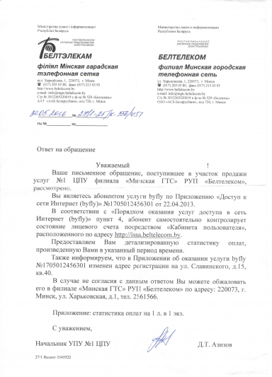Обжалование на ответ 27/1-25/н-556/451 от 30.05.2016, полученный от начальника УПУ №1 ЦПУ филиал Минская городская телефонная сеть РУП «Белтелеком», Азизова Д.Т.