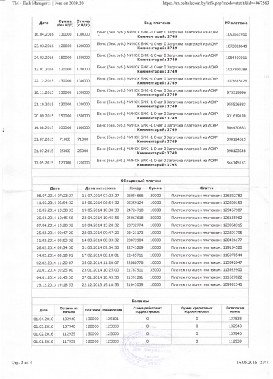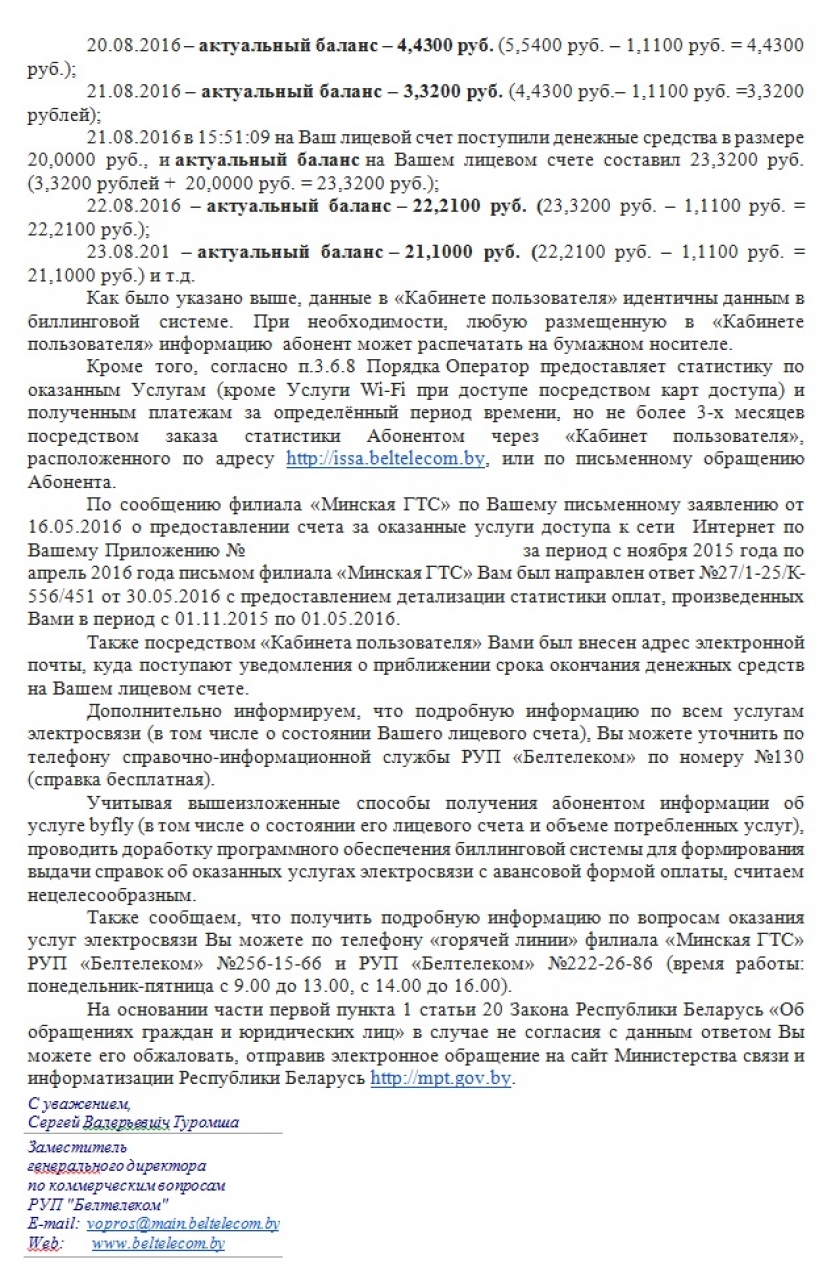Учитывая, что абонент может получить информацию об услуге byfly (в том числе о состоянии его лицевого счета и объеме потребленных услуг) различными способами (в "кабинете пользователя" на сайте, по электронной почте, в виде детализации по письменному обращению, по бесплатному номеру 130, по телефону горячей линии) проводить доработку программного обеспечения биллинговой системы для формирования выдачи справок об оказанных услугах электросвязи с авансовой формой оплаты, Белтелеком считает нецелесообразным.