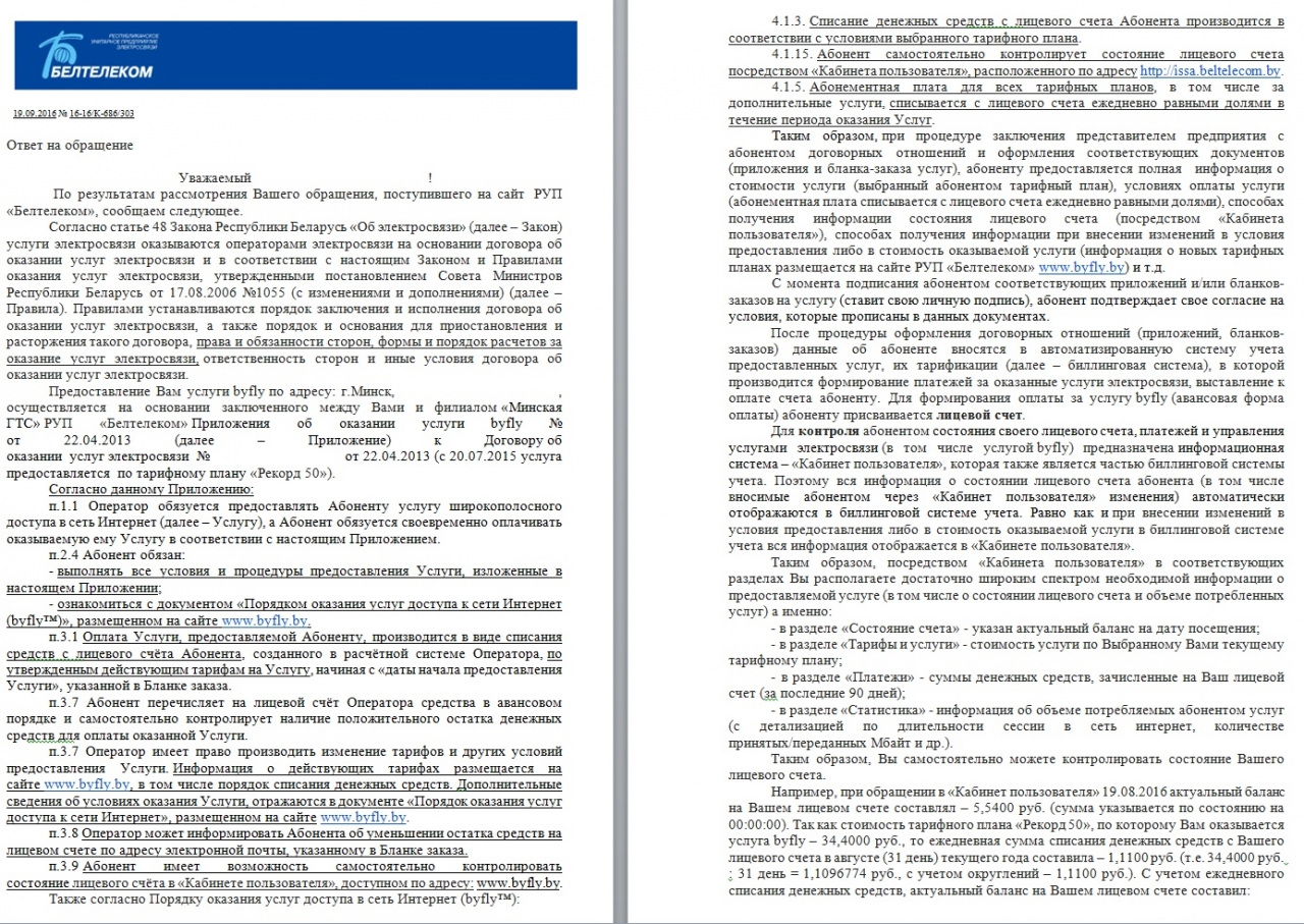 В своем обращении я просил предоставить счет за оказанные услуги в рамках Приложения «Доступ к сети Интернет (byfly)» за последние полгода помесячно. Причем просил оформить этот счет в соответствии с действующим в Беларуси законодательством.