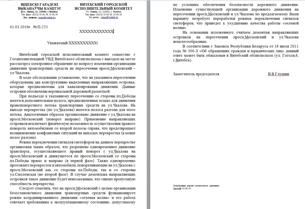 Изменение существующей организации дорожного движения на пересечении просп.Московский и ул.Чкалова по предлагаемому Вами варианту потребует переработки режима переключения сигналов светофоров, что приведет к ухудшению качества работы «зеленой волны».
