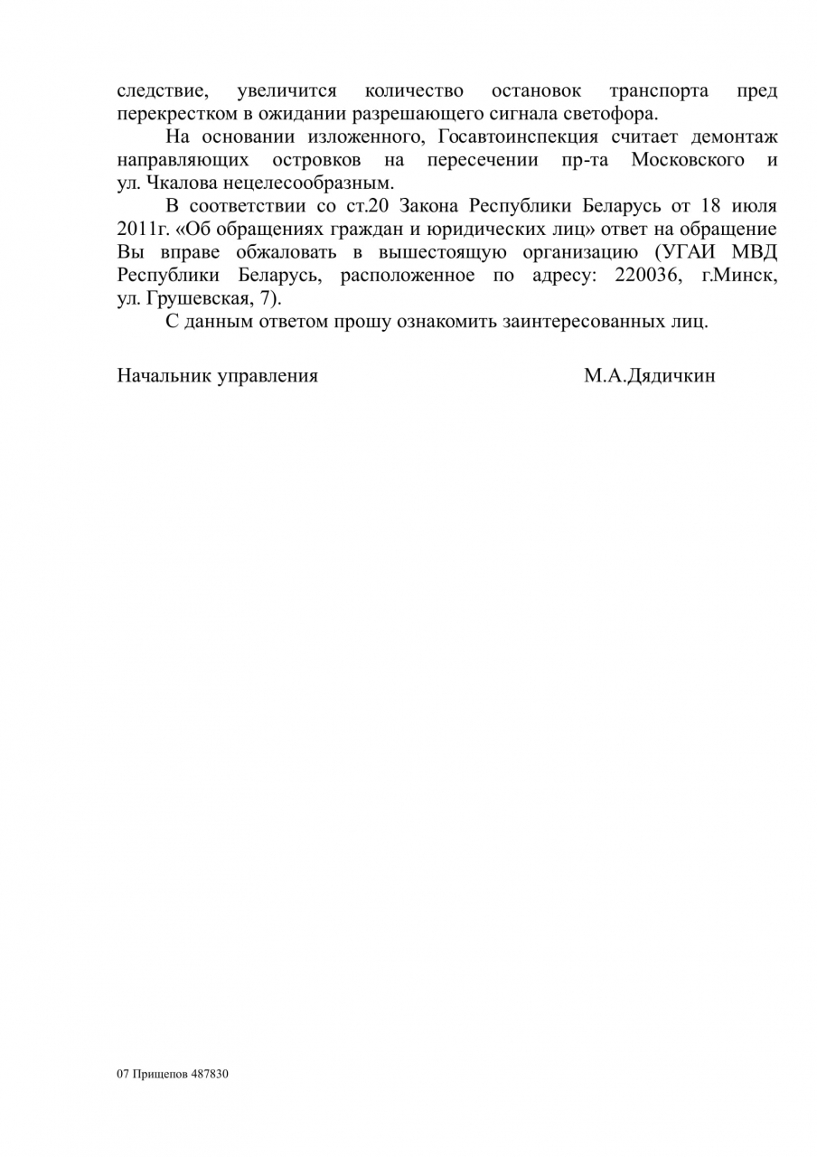 Изменение существующей организации дорожного движения на пересечении пр-та Московского и ул. Чкалова по предлагаемому варианту потребует переработки режима переключения сигналов светофоров, что приведёт к ухудшению качества работы «зелёной волны». При этом, как следствие, увеличится количество остановок транспорта перед перекрёстком в ожидании разрешающего сигнала светофора.