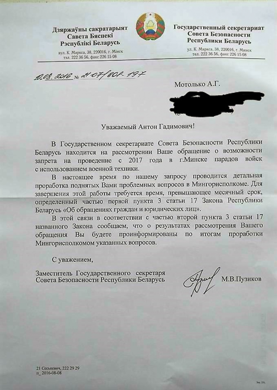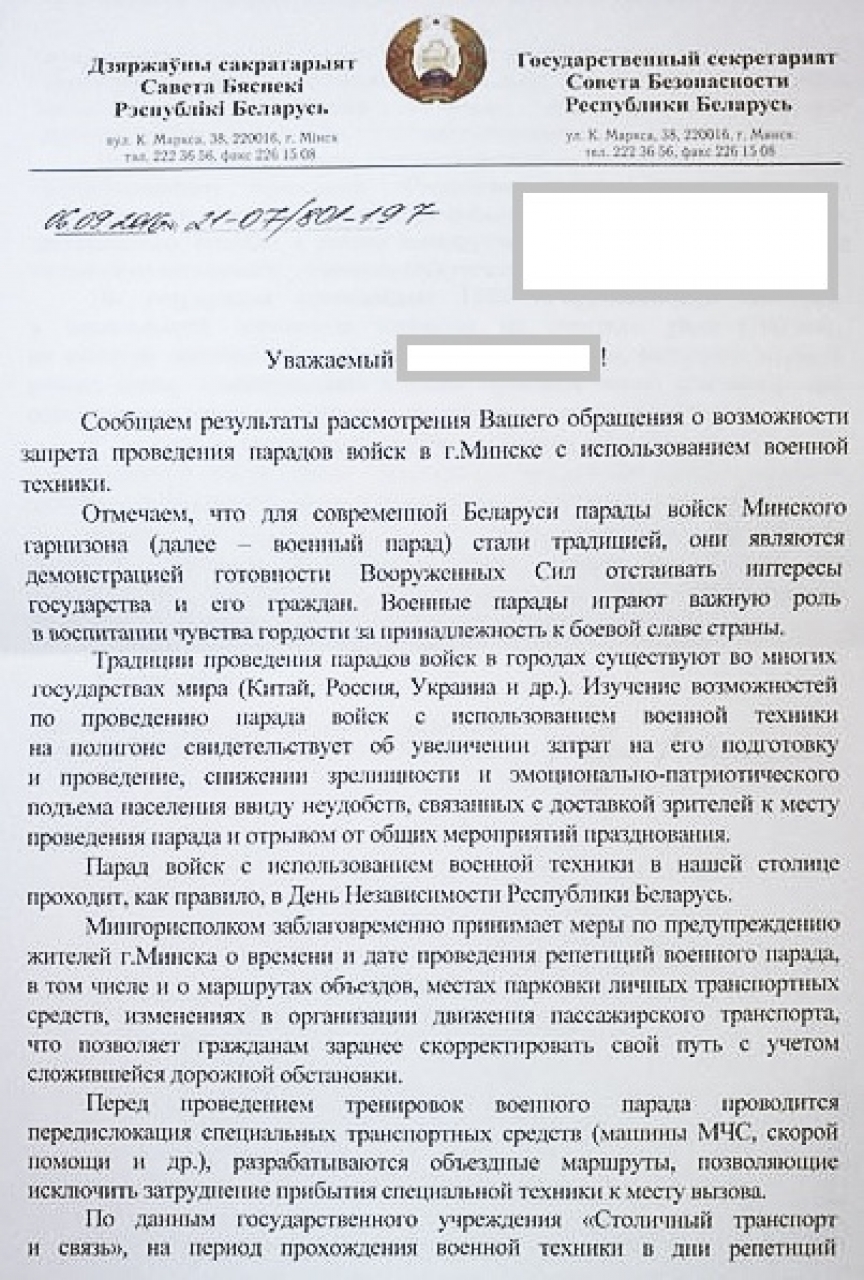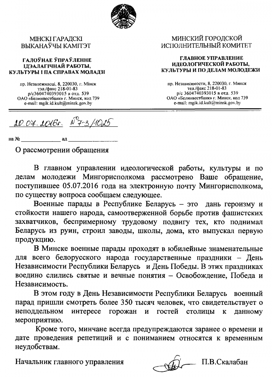Но ведь граждане не просили разъяснений, они требовали «запретить движение механизированной военной техники». А МГИК прислал им яркий пример «отписки», ответа не по существу, который теперь необходимо обжаловать. Кроме того, начальнику главного управления идеологической работы, культуры и по делам молодежи следовало бы знать, что в ответе необходимо указывать порядок обжалования обращения.