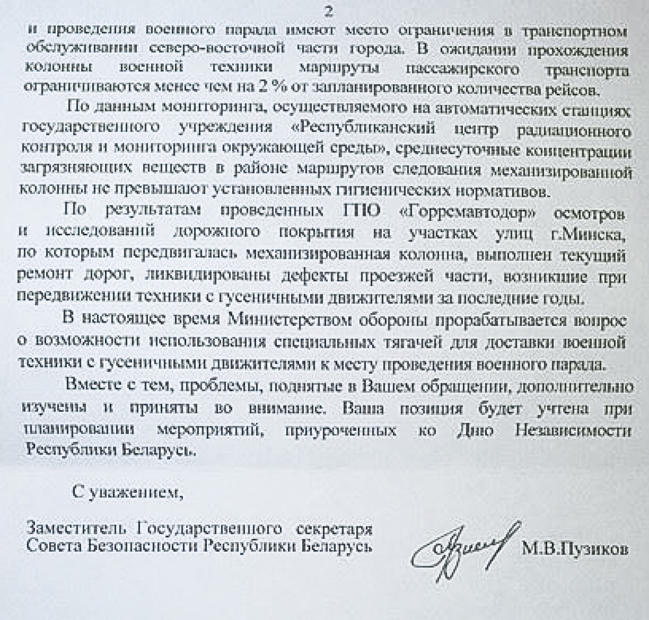 Убедительно просим рассмотреть возможность запрета на проведение парадов с использованием механизированной военной техники в пределах города Минска с 2017 года.