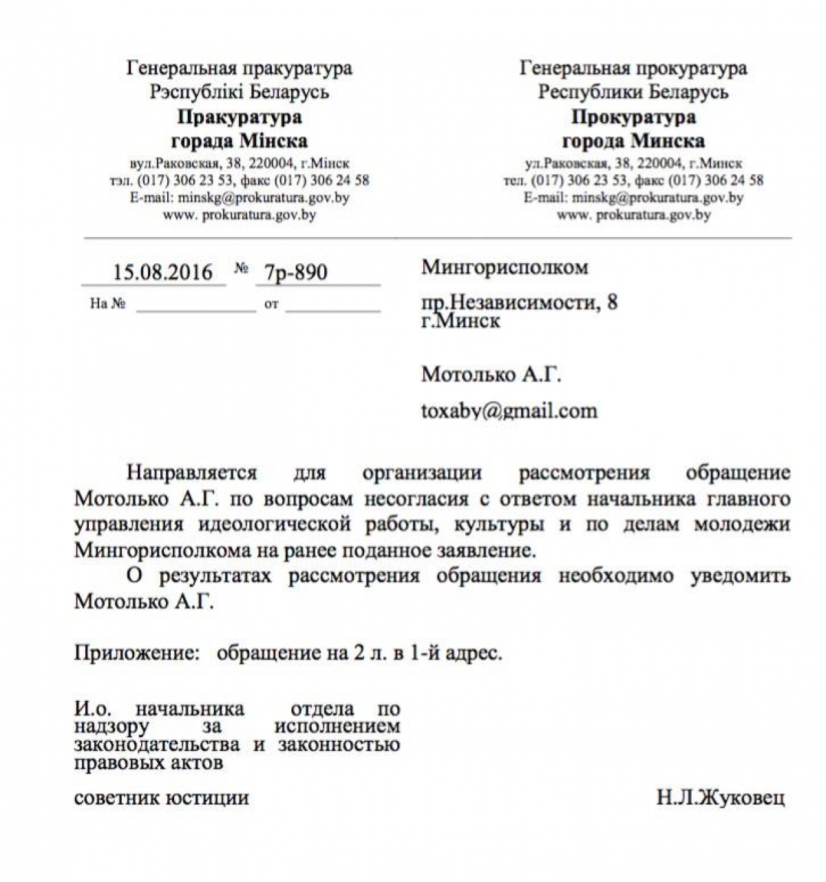 Обжалование ответа Мингорисполкома в Прокуратуре г. Минска: отправлено назад в Мингорисполком для повторного рассмотрения
