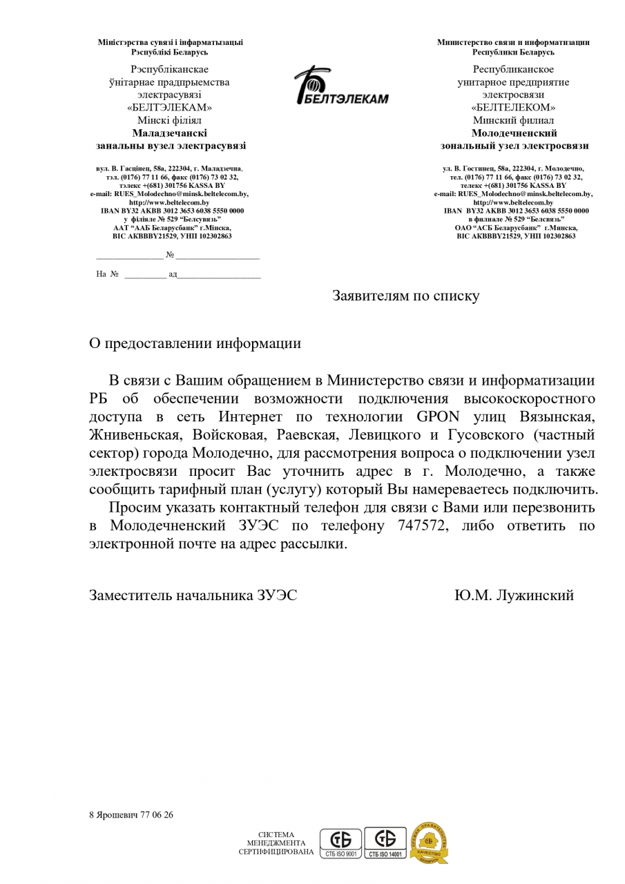 Мы, нижеподписавшиеся, просим обеспечить возможность подключения высокоскоростного Интернета по технологии GPON жителей улиц Вязынская, Жнивеньская, Войсковая, Раевская, Левицкого, Гусовского города Молодечно.