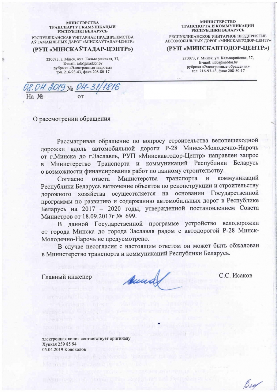 Мы, жители Заславля и иные неравнодушные граждане, на основании ст. 41 Закона «О местном управлении и самоуправлении», которая устанавливает, что исполкомы организуют строительство, реконструкцию, ремонт и содержание местных автомобильных дорог, управляют дорожной деятельностью, просим проложить обособленную асфальтированную велодорожку между Заславлем и Минском рядом с трассой Р28.