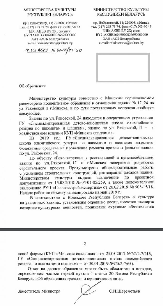 А также на основании Положения о Министерстве культуры, утвержденного постановлением Совета Министров Республики Беларусь от 17 января 2017 г. № 40, которым установлено, что Минкультуры осуществляет полномочия по охране историко-культурных ценностей, просим принять меры по сохранению и реконструкции (при необходимости) данных объектов со статусом "историко-культурная ценность".