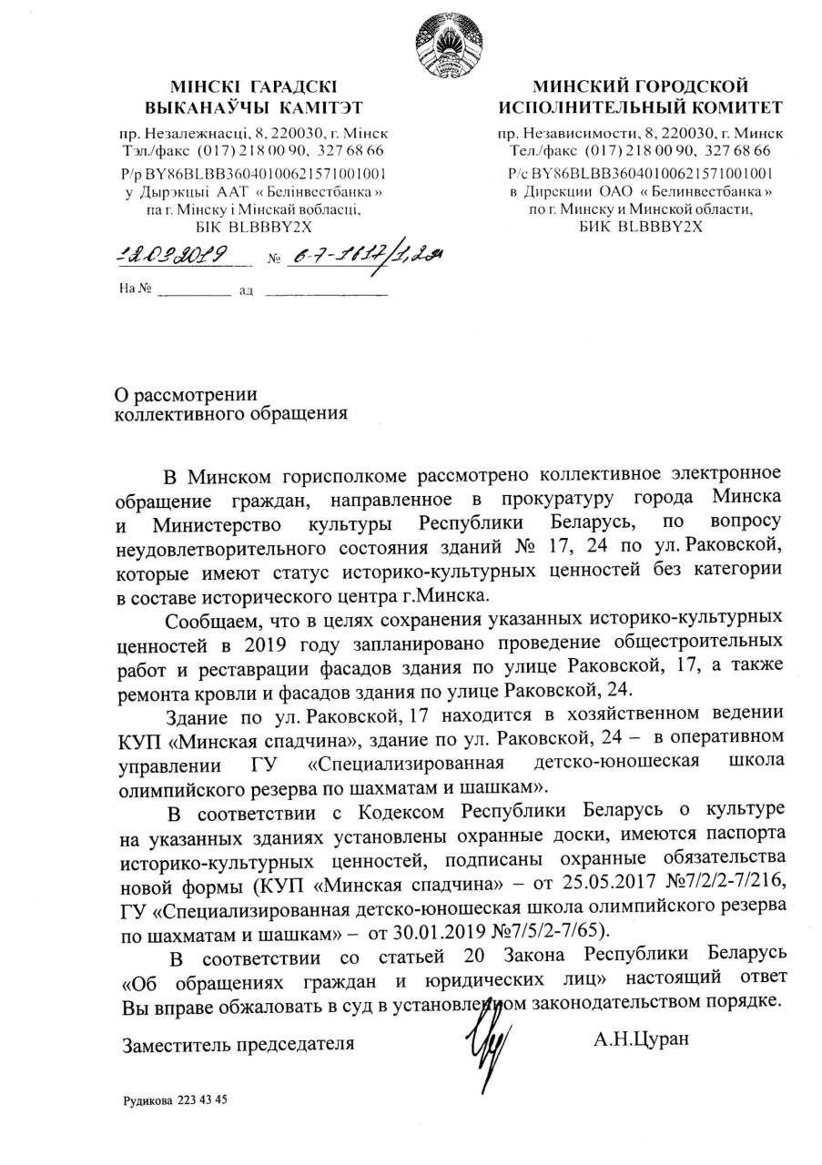 Мы, нижеподписавшиеся, просим прокуратуру г.Минска провести проверку на предмет установления признаков правонарушения, предусмотренного статьей 19.2. Кодекса Республики Беларусь об административных правонарушениях "Невыполнение обязанностей по установке охранных досок, составлению паспортов историко-культурных ценностей, подписанию и соблюдению требований охранных обязательств":