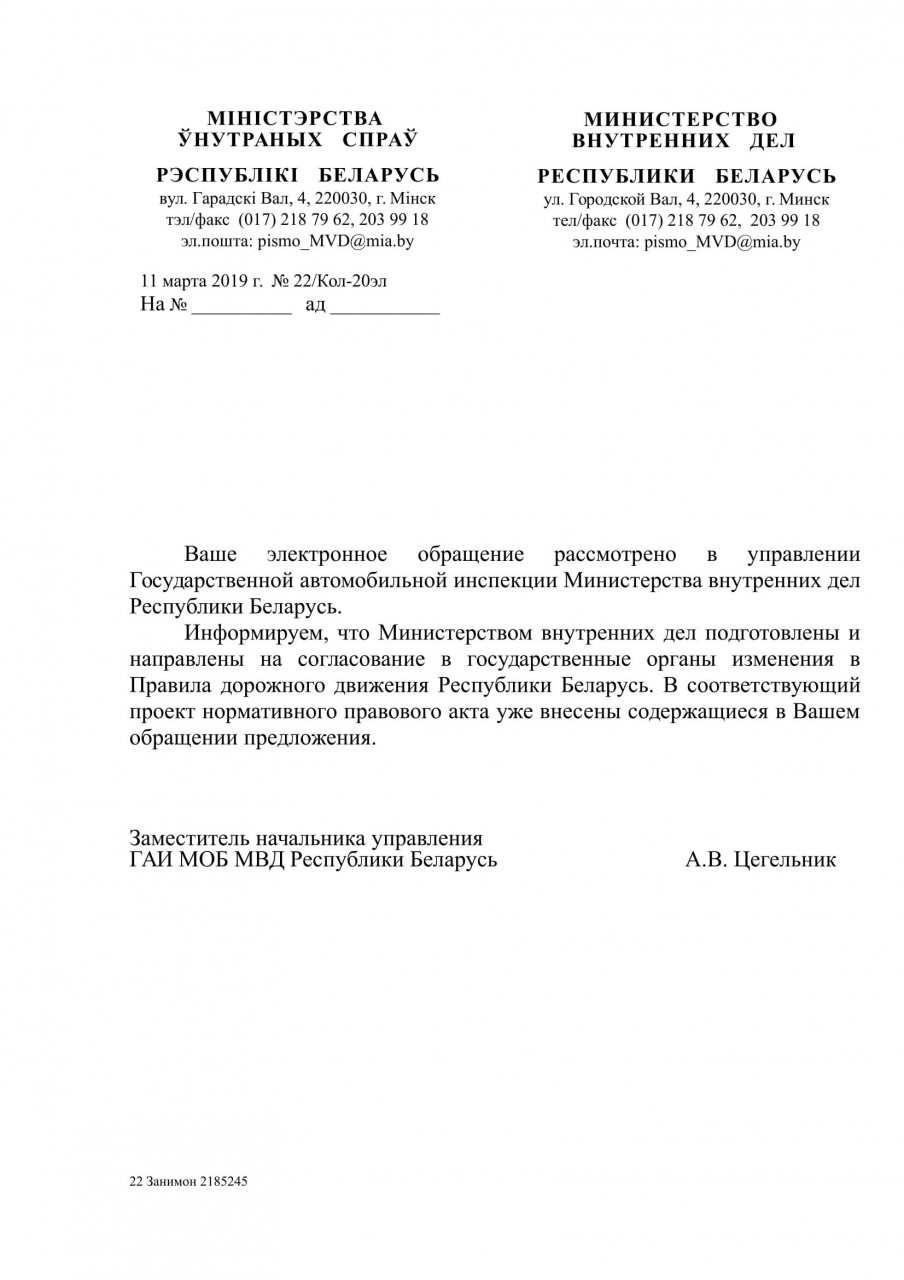 Таким образом, на основании Положения о Министерстве внутренних дел Республики Беларусь, утвержденного Указом Президента Республики Беларусь от 04.12.2007 N 611, которым к компетенции МВД отнесены вопросы организации и контроля за соблюдением законодательства в области дорожного движения и обеспечения его безопасности, просим внести изменения в ПДД, устранив запрет движения велосипедистов по тротуарам и велодорожкам при любых погодных условиях. Достаточно запретить движение велосипедистов в условиях снегопада и (или) гололедицы по проезжей части дорог, уточнив таким образом ст.153.4 ПДД.
