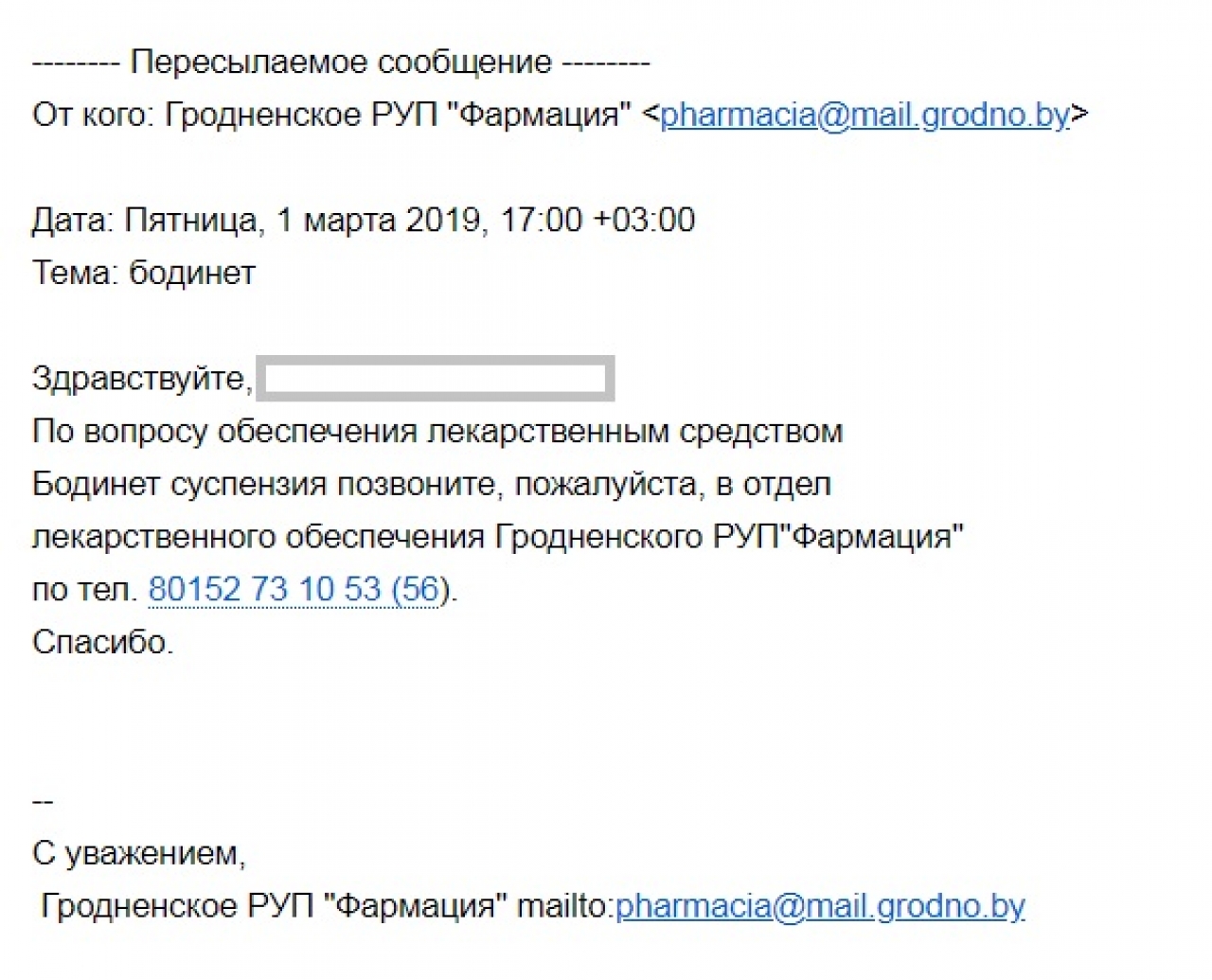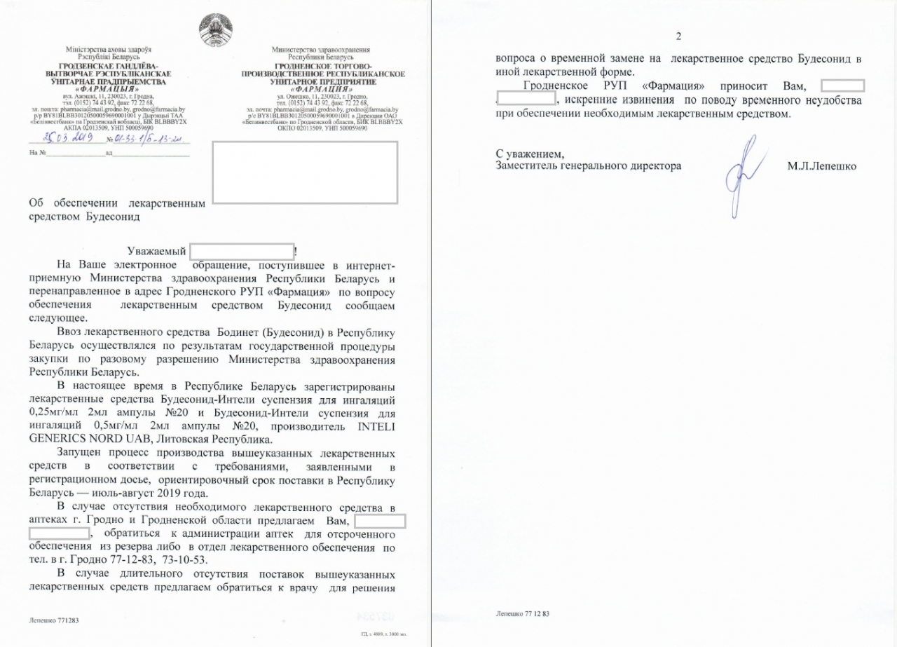 На основании Положения о Министерстве здравоохранения Республики Беларусь, утвержденного Постановлением Совета Министров Республики Беларусь от 28.10.2011 N 1446, которым установлено, что одной из основных задач Минздрава является организация лекарственного обеспечения населения Республики Беларусь, просим немедленно произвести регистрацию препарата "Бодинет" и обеспечить его наличие в аптеках Беларуси или обеспечить наличие в аптеках его аналога "Будесонид Интели" в форме суспензии