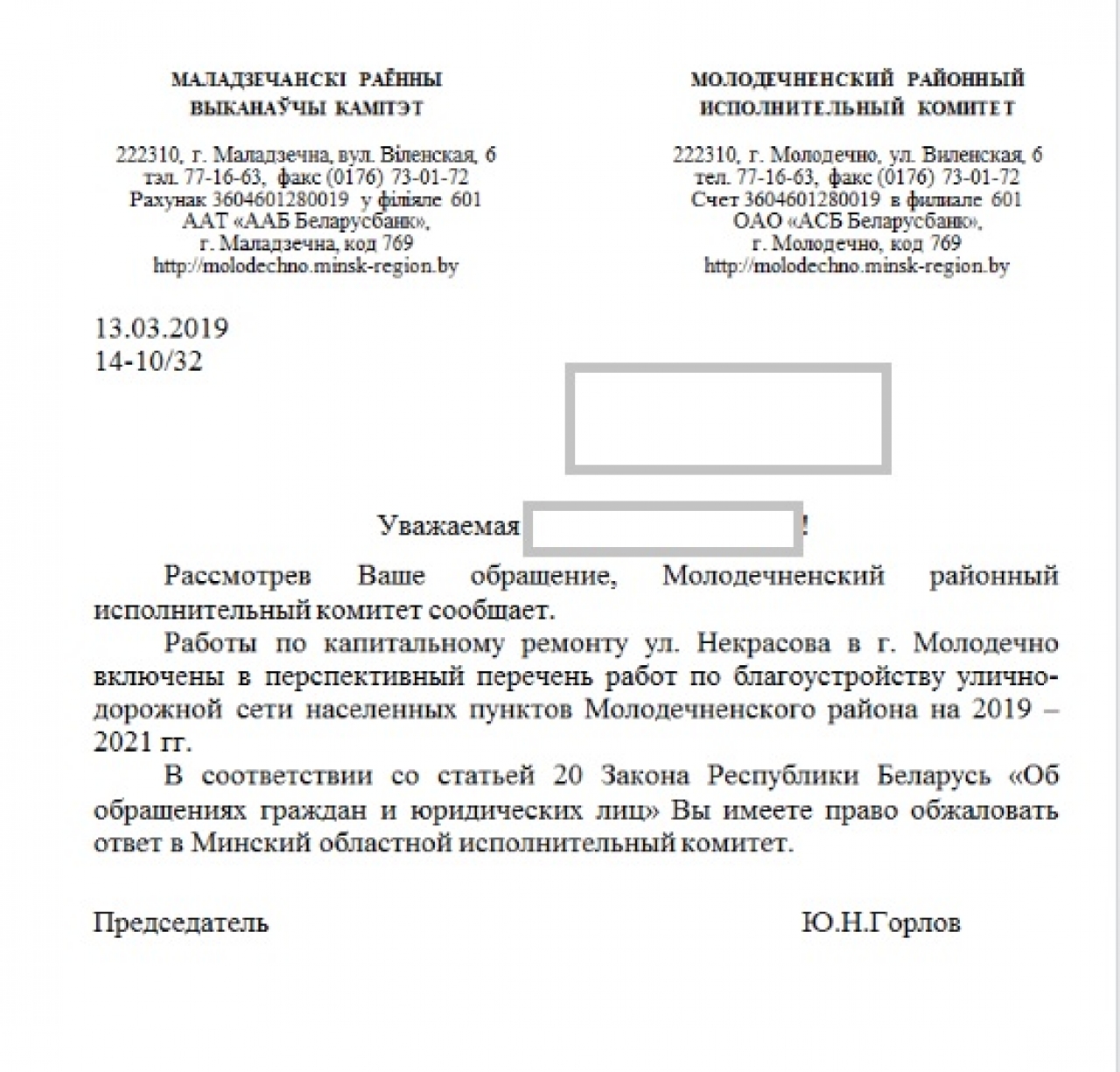 На основании ст. 41 Закона «О местном управлении и самоуправлении», которая устанавливает, что исполкомы организуют строительство, реконструкцию, ремонт и содержание местных автомобильных дорог, управляют дорожной деятельностью, мы, нижеподписавшиеся под настоящим коллективным обращением, требуем: