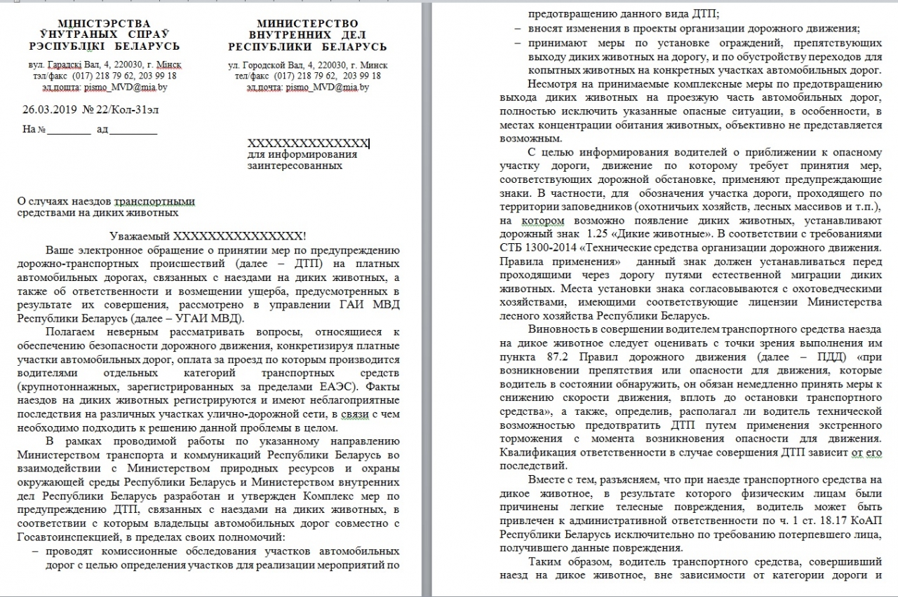 По нашим наблюдениям участились случаи наезда на диких животных на дорогах Республики Беларусь, в связи с чем полагаем, что принятия мер по ограждению платных скоростных автомагистралей явно недостаточно и водитель, управляя транспортным средством, не может быть полностью уверен в отсутствии диких животных на пути следования автомобиля.