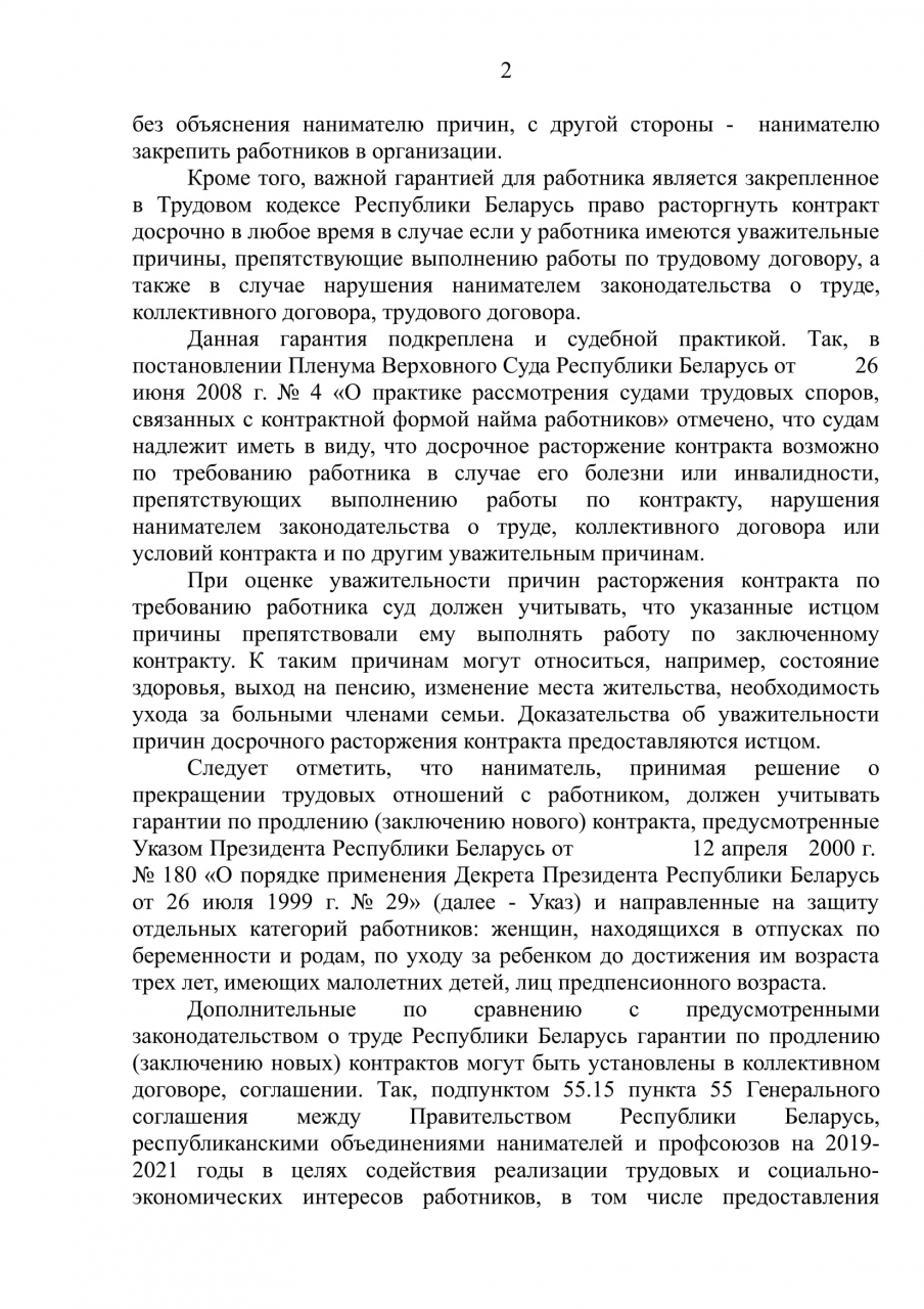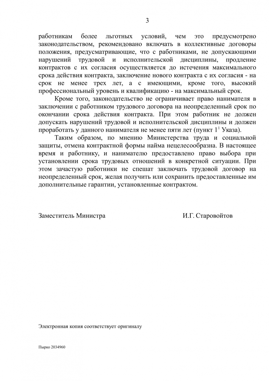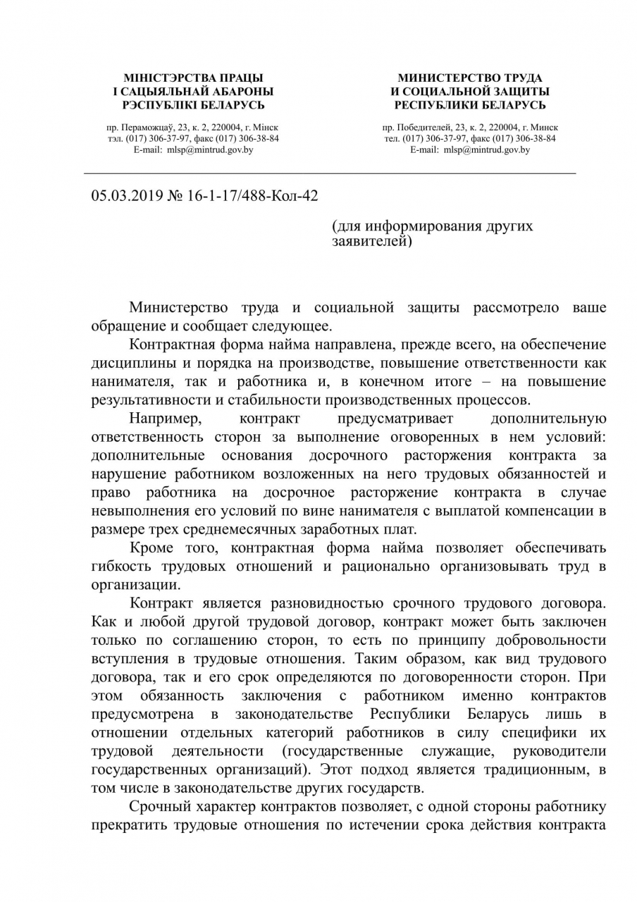 Поскольку, по нашему мнению, наниматель имеет право по истечении срока действия трудового контракта без лишних объяснений распрощаться с работником и последний таким образом остаётся без работы и средств к существованию, просим принять меры по упразднению такой формы найма как трудовой контракт.
