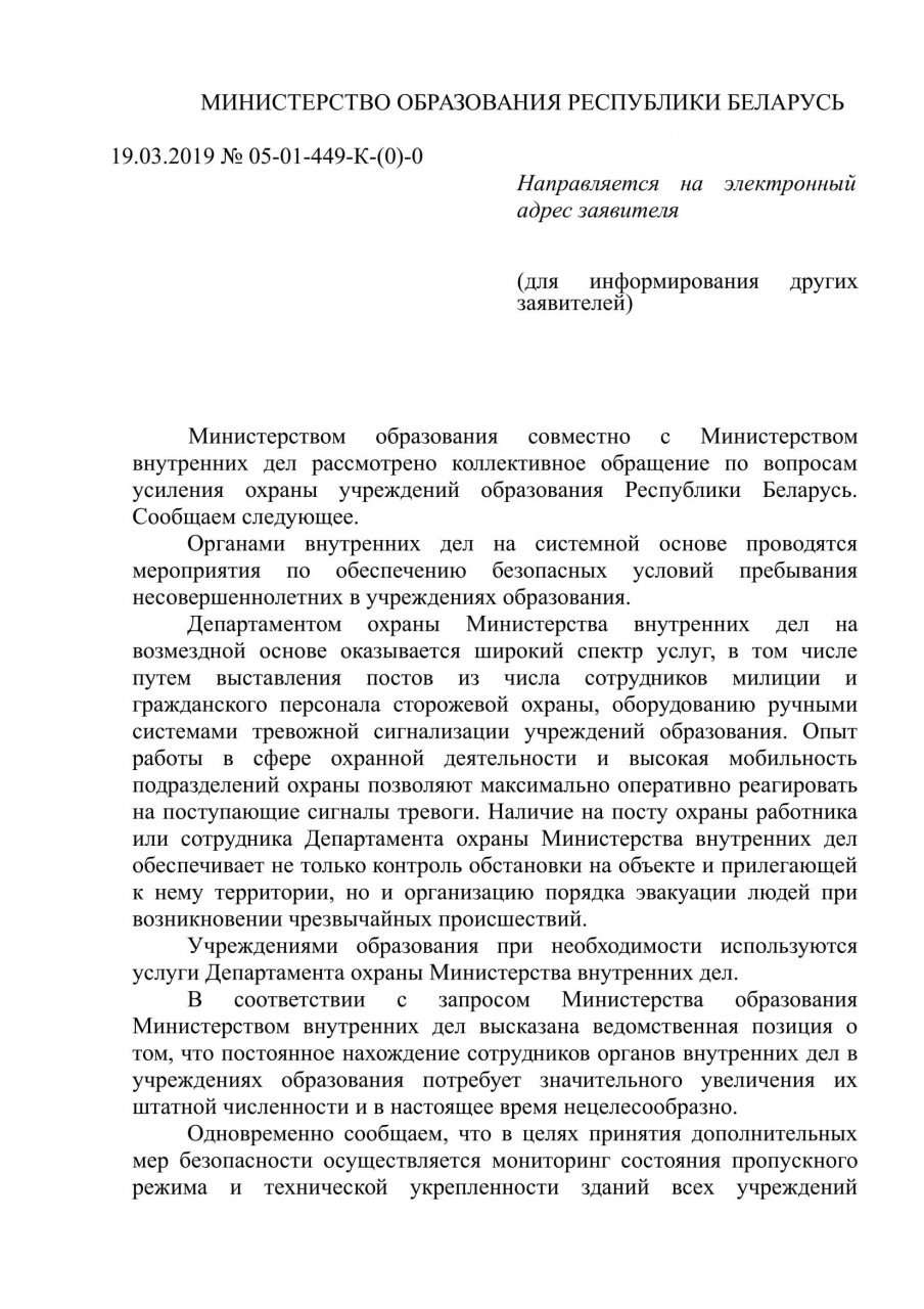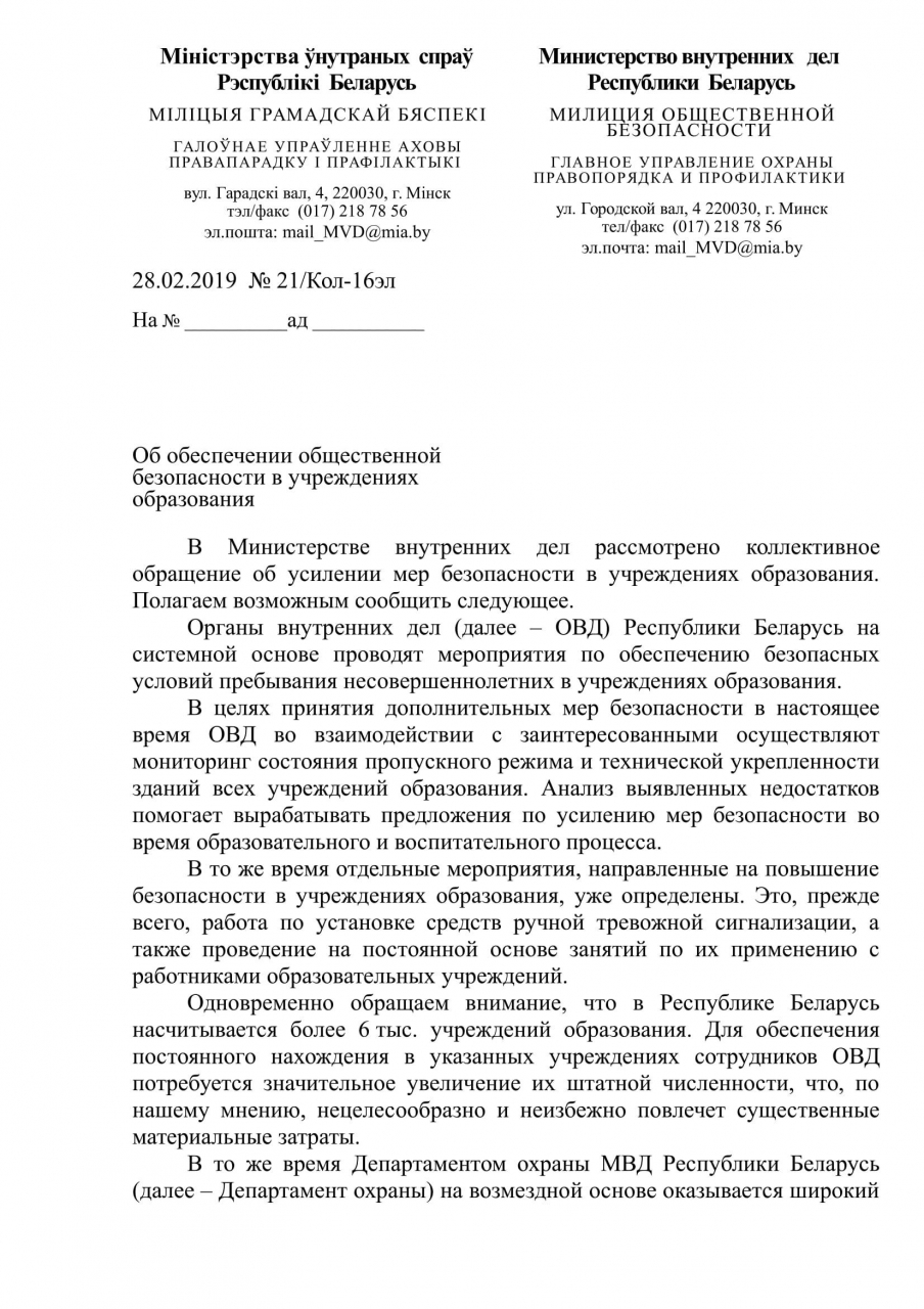 Поэтому мы, граждане Беларуси, требуем усилить охрану учебных заведений Беларуси и для этого разместить на постоянной основе в каждом учебном корпусе и каждом общежитии каждого учебного заведения Беларуси дежурного милиционера.