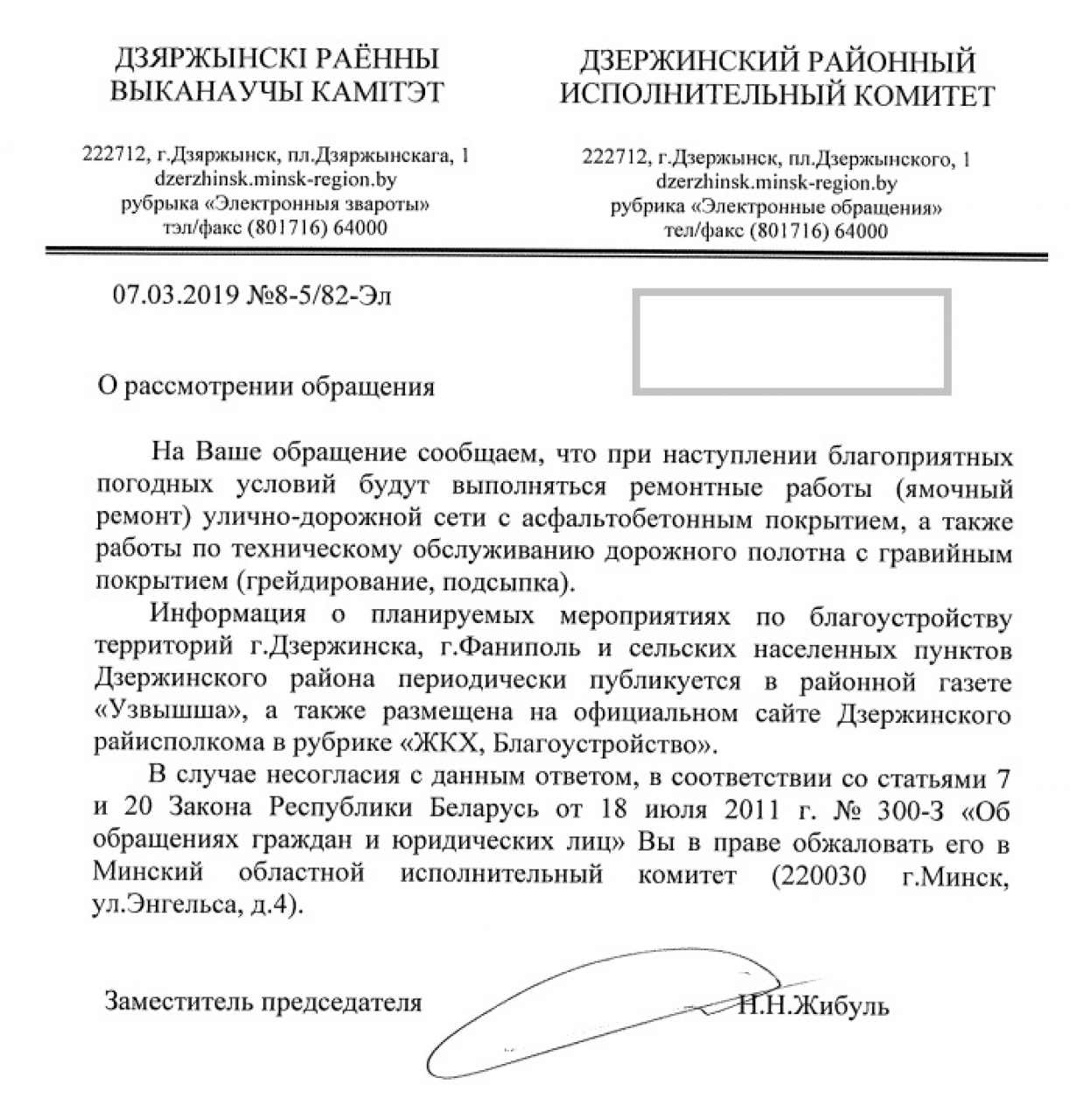 На основании ст. 41 Закона Республики Беларусь «О местном управлении и самоуправлении», которая устанавливает, что исполкомы организуют строительство, реконструкцию, ремонт и содержание местных автомобильных дорог, управляют дорожной деятельностью, связанной с автомобильными дорогами необщего пользования, просим обратить внимание на настоящее обращение и принять меры по ремонту дорог в городе Фаниполь.