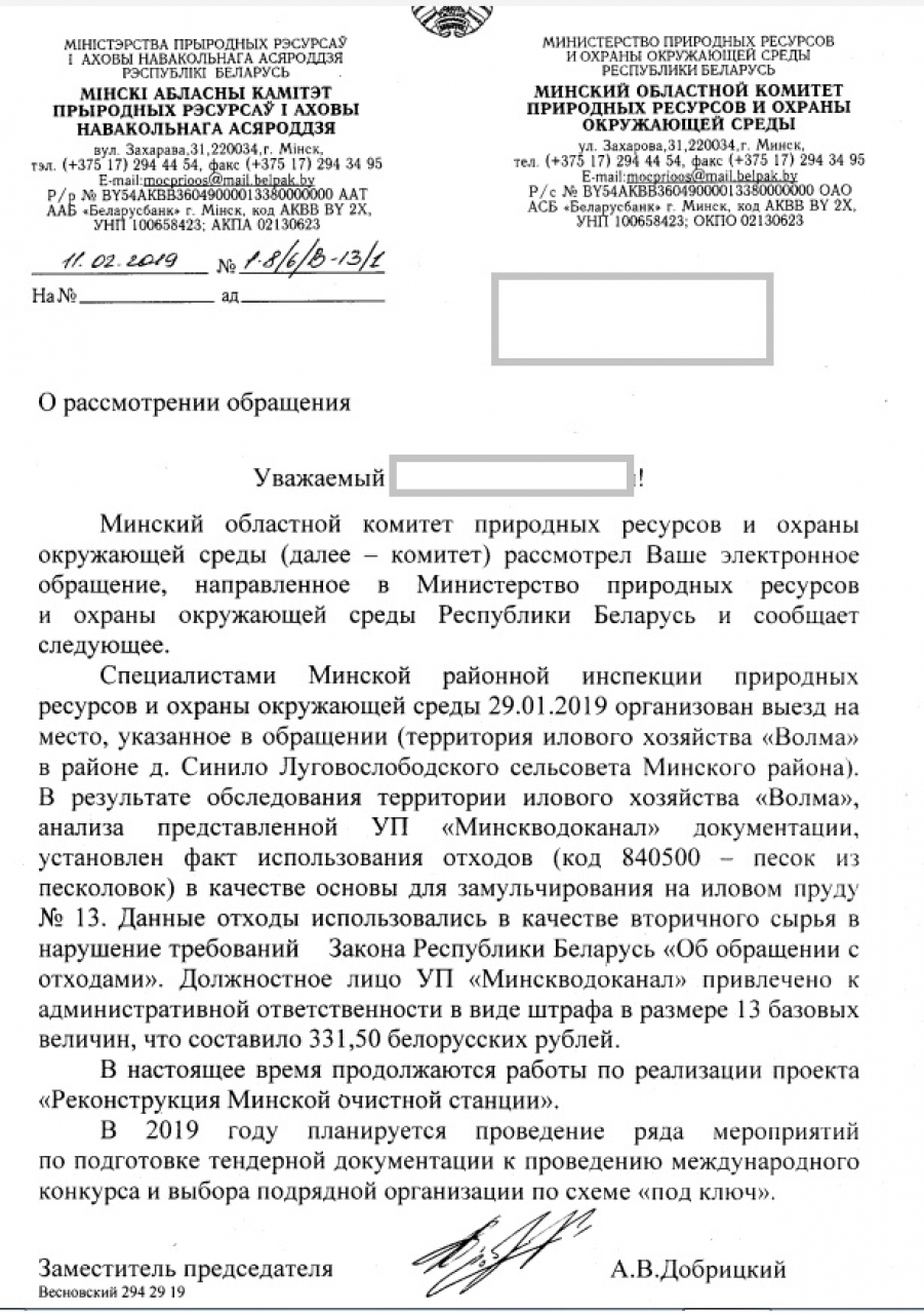 2. Принятые меры на наш взгляд недостаточны, УП "Минскводоканал" в ответах утверждает, что и на пруд №4 они выгружают этот песок (см. приложение -- ответ на обращение УП "Минскводоканал"). В видео и фото-материалах оригинального сообщения указано на проблему отгруза в пруды №№ 4, 13, 14. Ответ получен только по №13.
