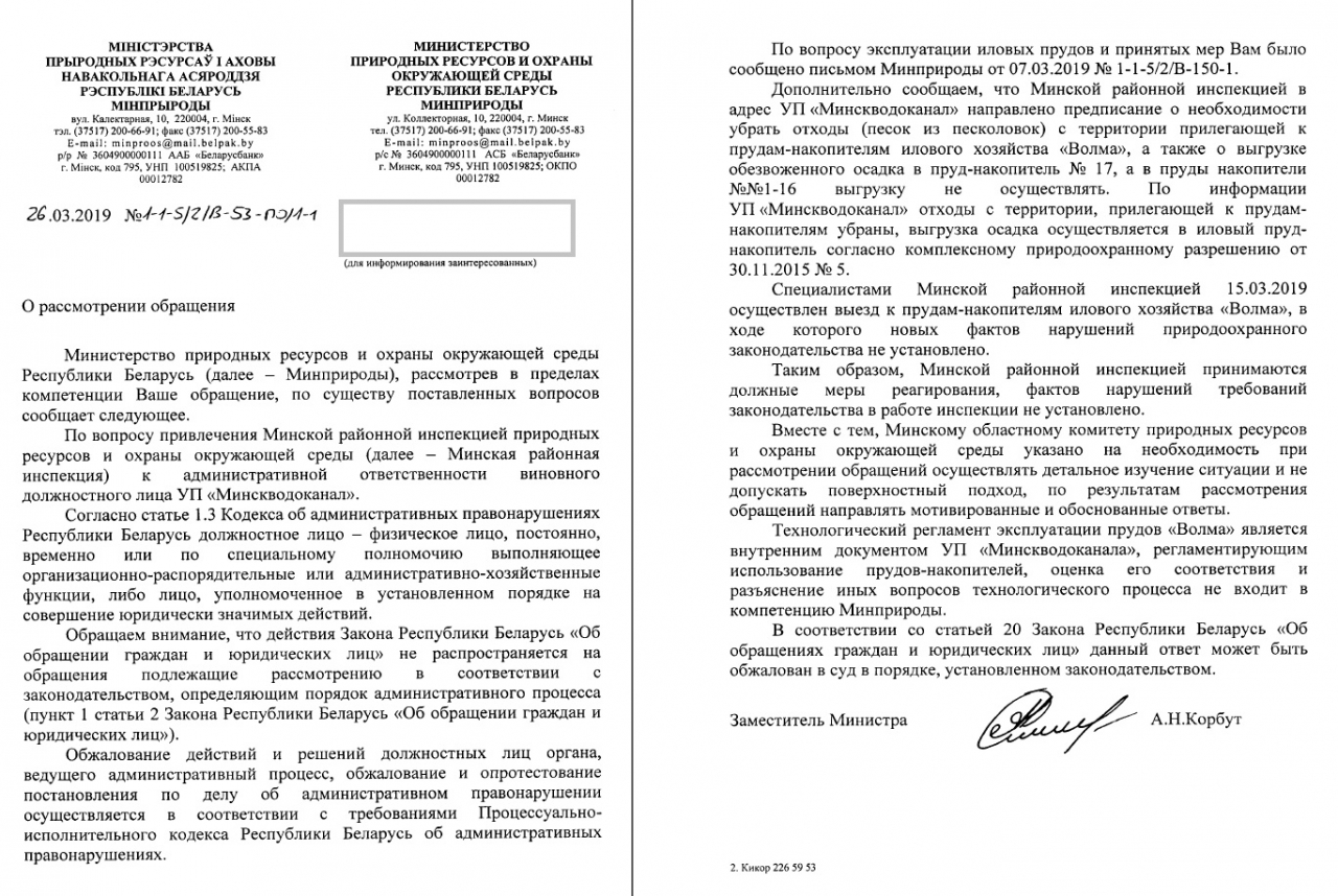 Прошу обеспечить надлежащее рассмотрение обращения. В рамках обращения прошу рассмотреть соответствие действий УП "Минскводоканала" внутренним документам организации, регламентирующих использование прудов накопителей, а именно "Технологическому регламенту эксплуатации прудов "Волма", ТИ 02-02-2016 .