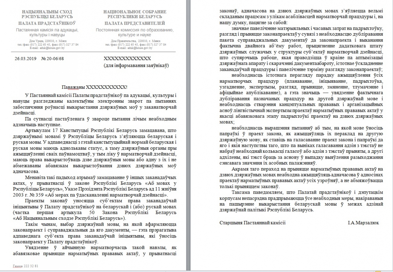 Прапануем з наступнай сесіі Палаты прадстаўнікоў прымаць усе законы і пастановы на дзвюх дзяржаўных мовах, беларускай і расейскай.