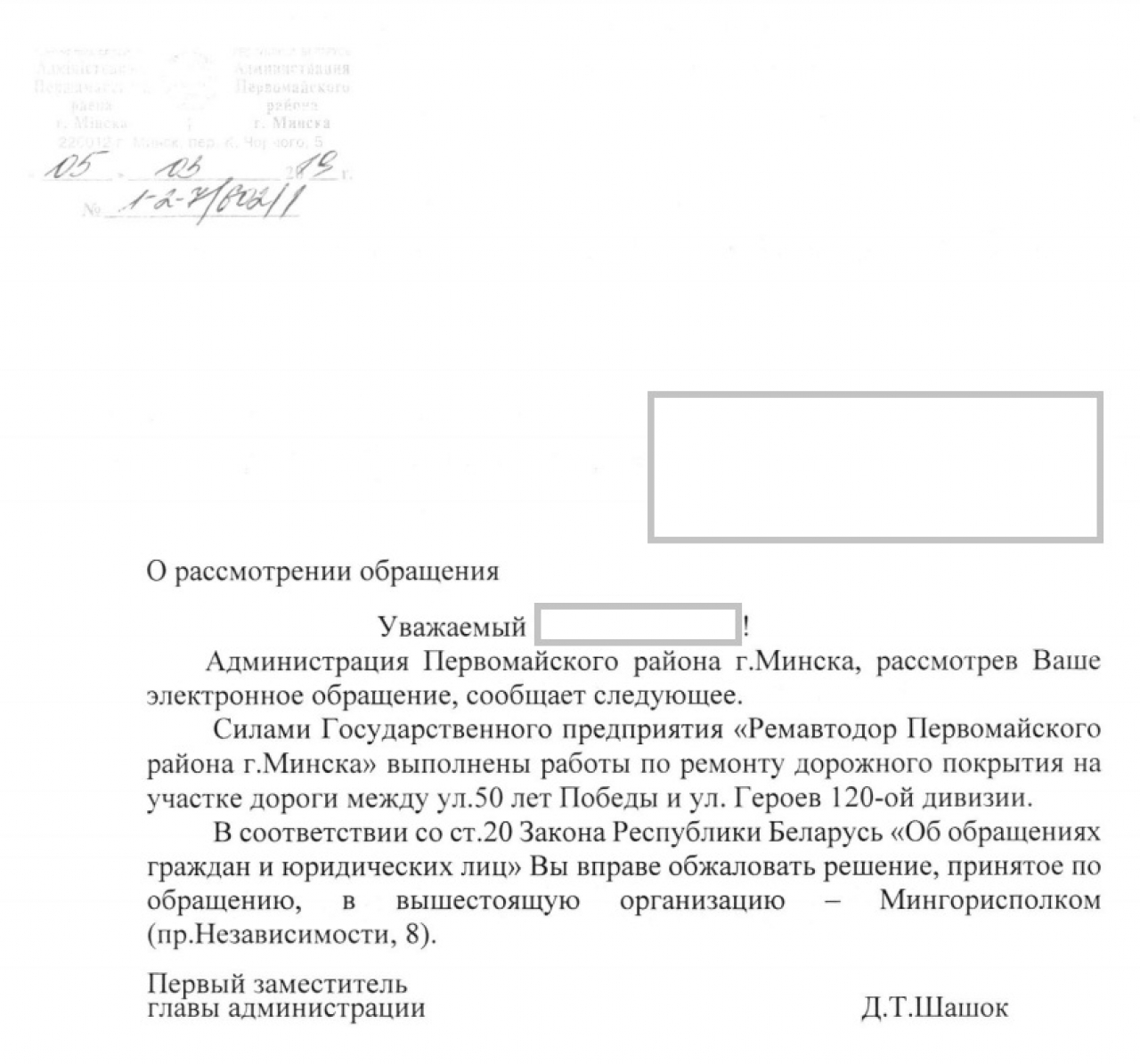 Просьба привести в надлежащее состояние дорожное покрытие на участке дороги между ул. 50 лет Победы и ул. Героев 120-ой дивизии.