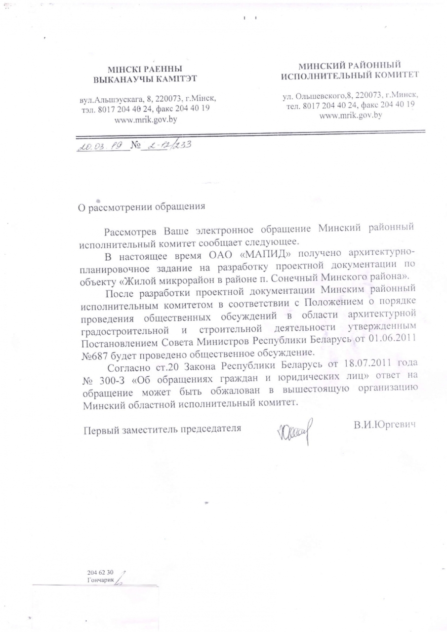 Несмотря на однозначное правое регулирование поведения местных органов управления и самоуправления в случае планирования жилищного строительства, Минский районный исполнительный комитет не организовал проведение общественных обсуждений по объекту «Жилой микрорайон в районе п. Сонечный Минского района», заказчиком и застройщиком которого является ОАО «МАПИД», а на предложение сделать это - отказал в их проведении.
