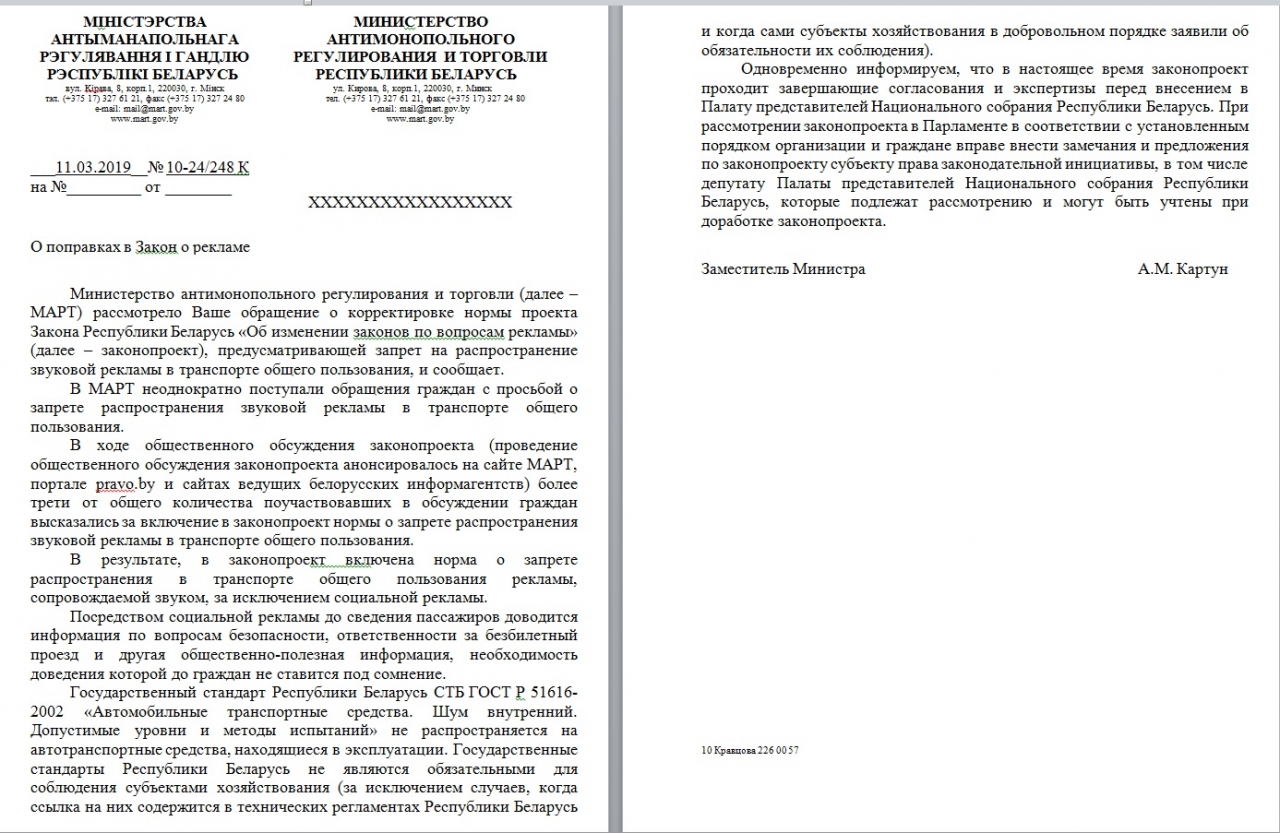 В ходе общественного обсуждения законопроекта (проведение общественного обсуждения законопроекта анонсировалось на сайте МАРТ, портале pravo.by и сайтах ведущих белорусских информагентств) более трети от общего количества поучаствовавших в обсуждении граждан высказались за включение в законопроект нормы о запрете распространения звуковой рекламы в транспорте общего пользования.