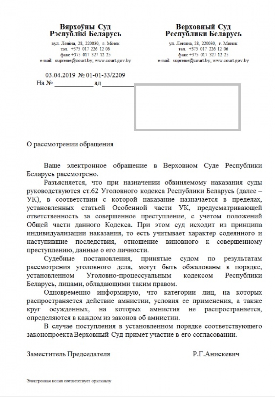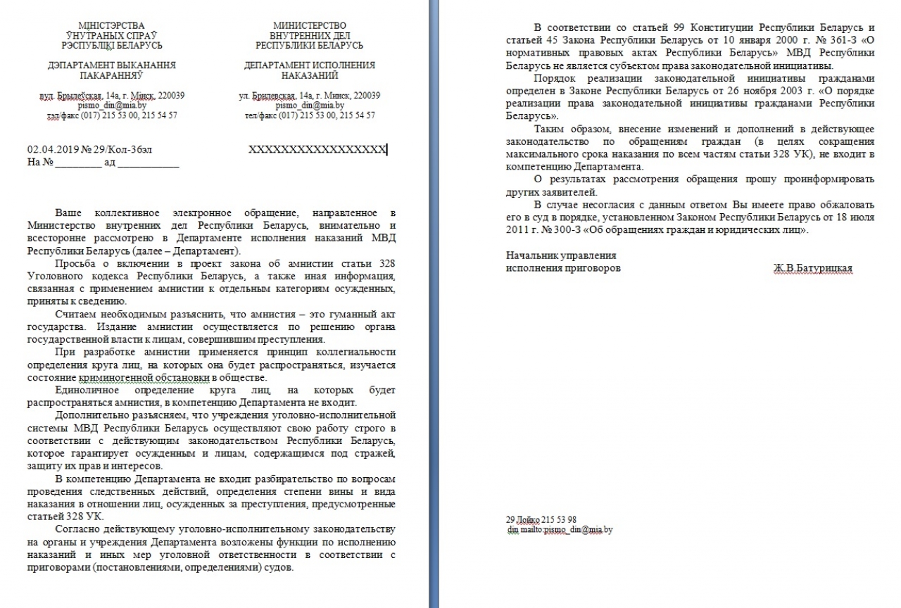 Просьба о включении в проект закона об амнистии статьи 328 Уголовного кодекса Республики Беларусь, а также иная информация, связанная с применением амнистии к отдельным категориям осужденных, приняты к сведению.