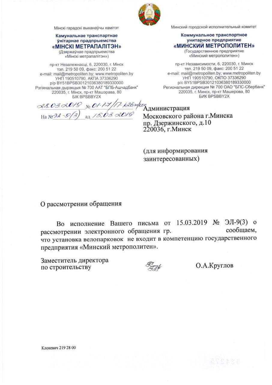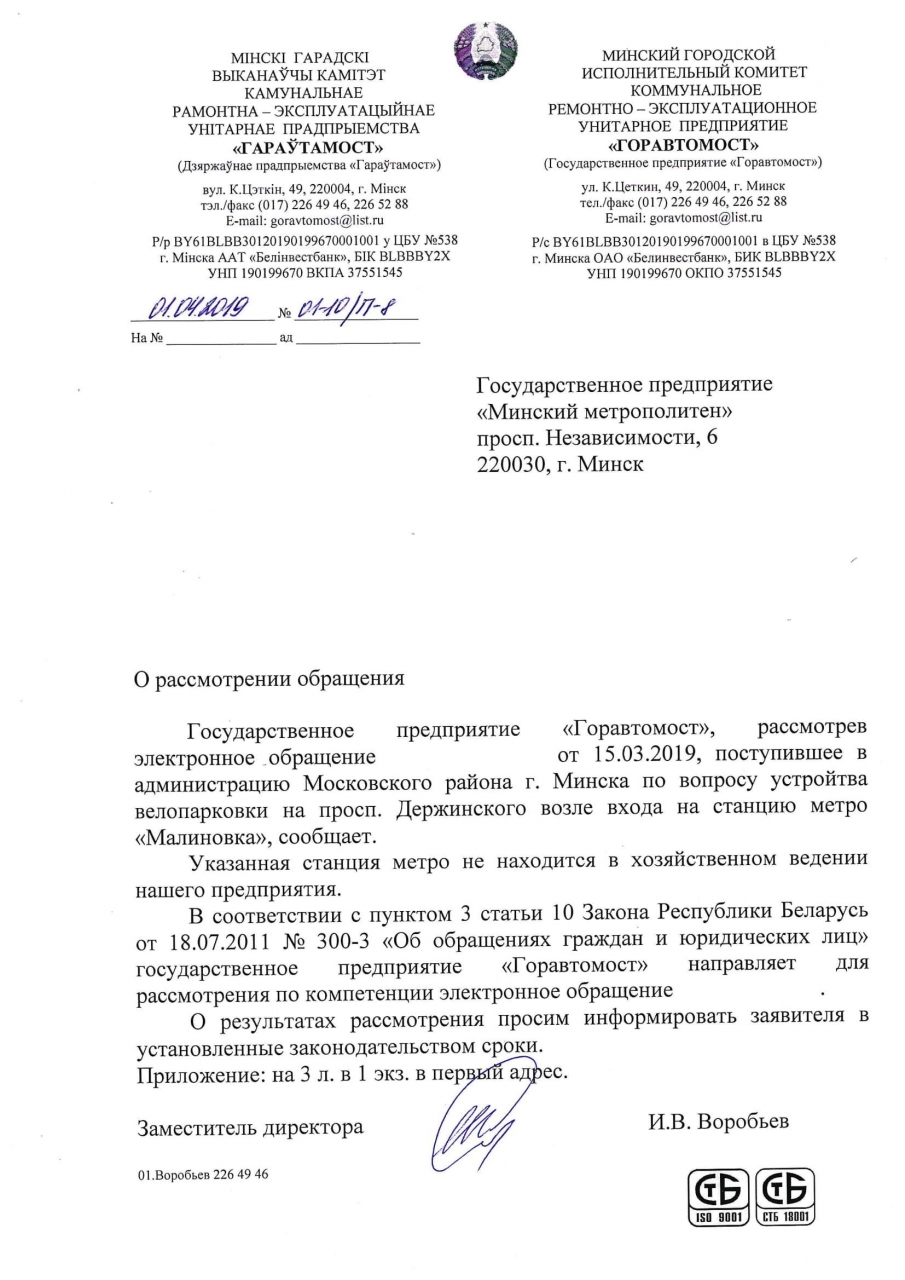 На основании ст. 41 Закона «О местном управлении и самоуправлении», которая устанавливает, что исполкомы организуют работу по благоустройству населенных пунктов, просим принять меры по оборудованию велопарковки в вышеуказанном месте.