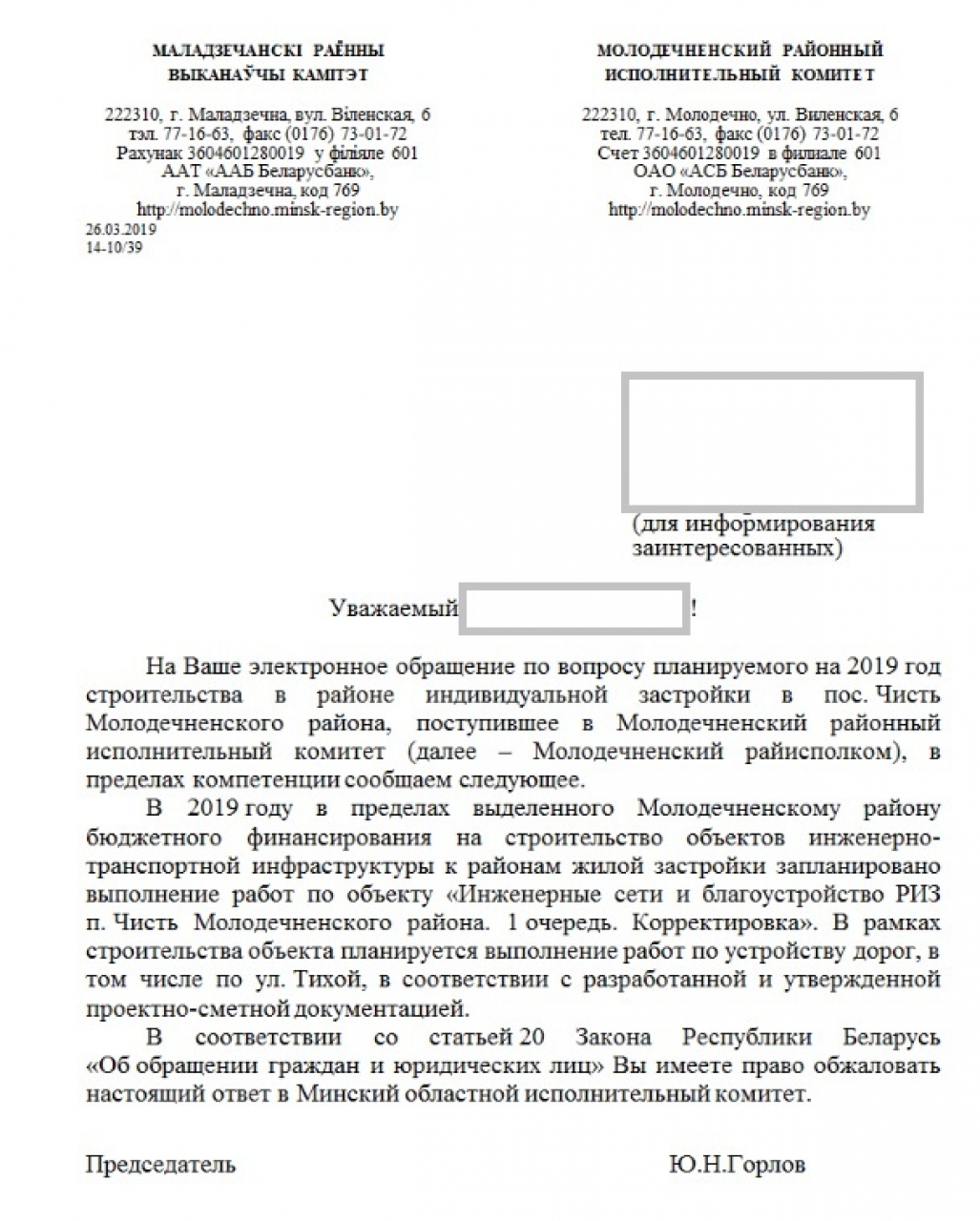 31 августа 2018 был получен ответ на электронное обращение по вопросам строительства дорог и благоустройства в РИЗе пос. Чисть (копия ответа прилагается). В указанном ответе сообщается, что продолжение работ по строительству объекта "Инженерные сети и благоустройство РИЗ п. Чисть Молодечненского района, 1 очередь. Корректировка" будет продолжено в 2019 году.