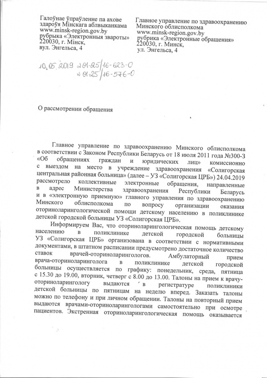 На основании Положения о Министерстве здравоохранения, утвержденного Постановлением Совета Министров Республики Беларусь от 28.10.2011 N 1446, которым установлено, что основной задачей Минздрава является организация оказания медицинской помощи населению Республики Беларусь, убедительно просим оказать помощь Солигорской ЦРБ в поиске и подготовке штатных специалистов отоларингологов для детской поликлиники.