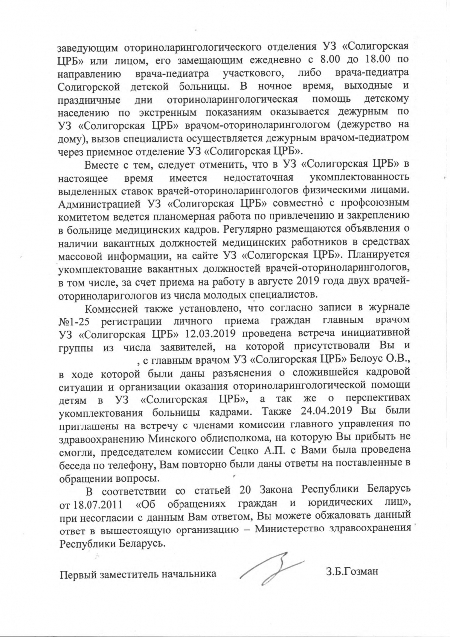 Порядок работы данного специалиста руководство Солигорской ЦРБ организовало следующим образом. Врач принимает по вторникам и четвергам с 8 до 13 часов, а в остальные рабочие дни по 2 часа. В результате чего дети, испытывающие острую боль в ушах и с высокой температурой, не могут своевременно получить обследование для назначения правильного лечения. Родителям также рекомендуют с проблемами по части отоларингологии обращаться к участковому педиатру, который при всем желании оказать помощь, не имеет соответствующих инструментов и практики. Зачастую детям ставят неверные диагнозы и лечение не приносит должного результата. В часы приема у дверей лор-врача скапливается сразу несколько многочасовых очередей, в которой одновременно ожидают прием больные дети по талонам и без талонов, дети на мед. комиссии, больные дети со стационара.