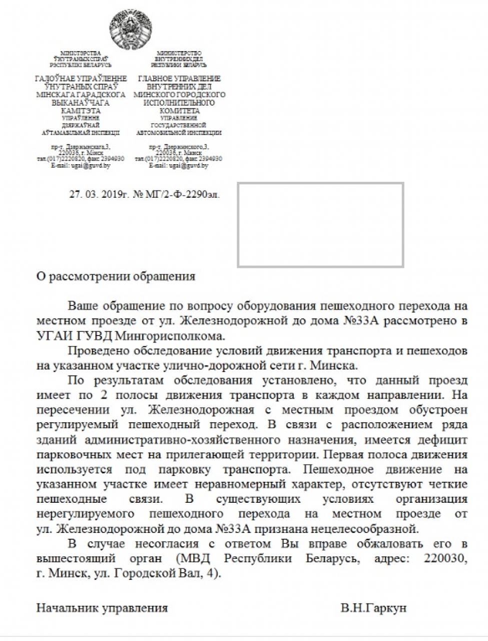 Учитывая что от вышеназванной автостанции расположены пешеходные переходы вдоль Железнодорожной улицы со стороны АС "Юго-западная", а не пересекая саму улицу в вышеназванном месте, на основании ст. 41 Закона «О местном управлении и самоуправлении», которая устанавливает, что исполкомы организуют строительство, реконструкцию, ремонт и содержание местных автомобильных дорог, управляют дорожной деятельностью, просим: