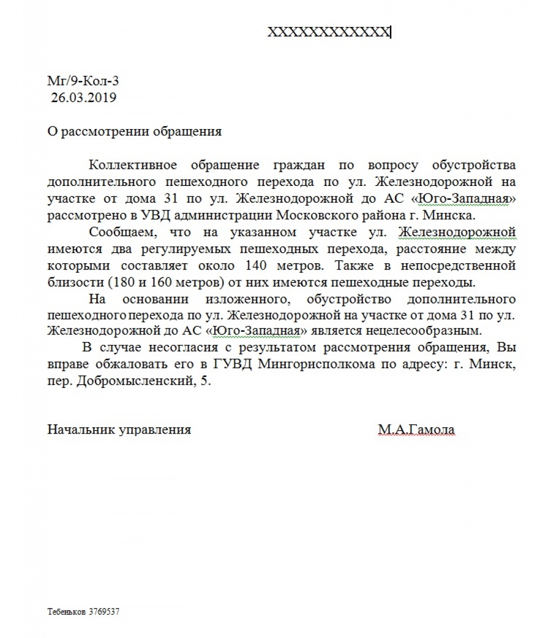Принимая во внимание тот факт, что отсутствие пешеходного перехода рядом с домом № 31, и со стороны АС "Юго-западная", создаёт трудности в передвижении пешеходов, а также то, что передвижение по данной улице в названном месте создало бы удобства для передвижения граждан, просим отнестись к этому с пониманием.