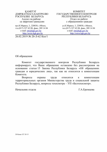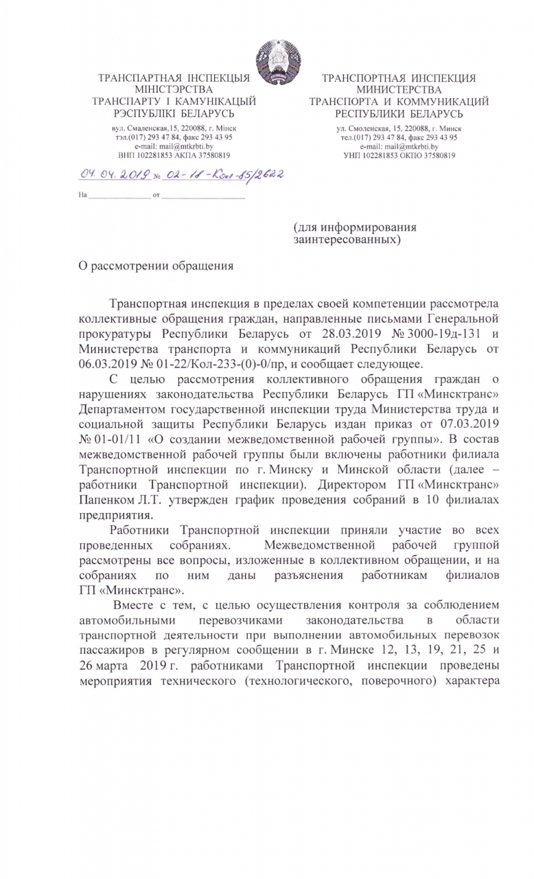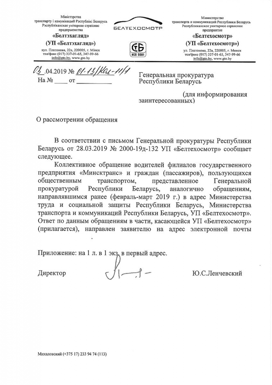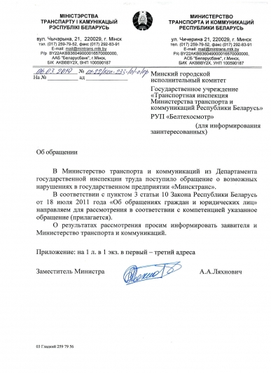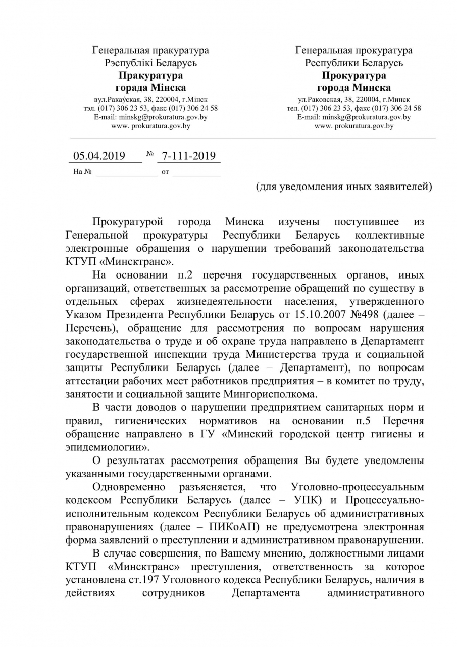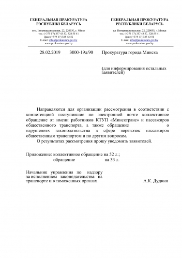 - дать правовую оценку действиям должностных лиц ГП «Минсктранс», совершаемым в отношении заявителей, подписавших обращение, и в случае установления признаков правонарушений, в том числе предусмотренного ст. 197 УК Республики Беларусь, привлечь виновных лиц к ответственности, предусмотренной законодательством;