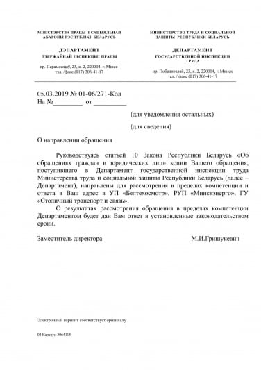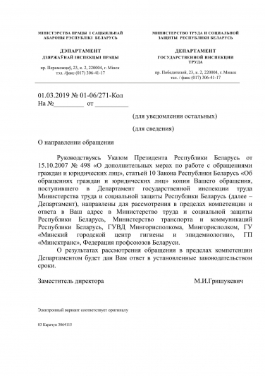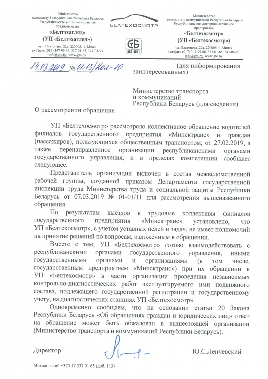 - провести проверку и выяснить на каком основании Департамент государственной инспекции труда, игнорируя просьбу, содержащуюся в коллективном обращении и п.6 ст.10 Закона "Об обращениях граждан и юридических лиц", передал личные данные заявителей, подписавших обращение, в ГП «Минсктранс»;