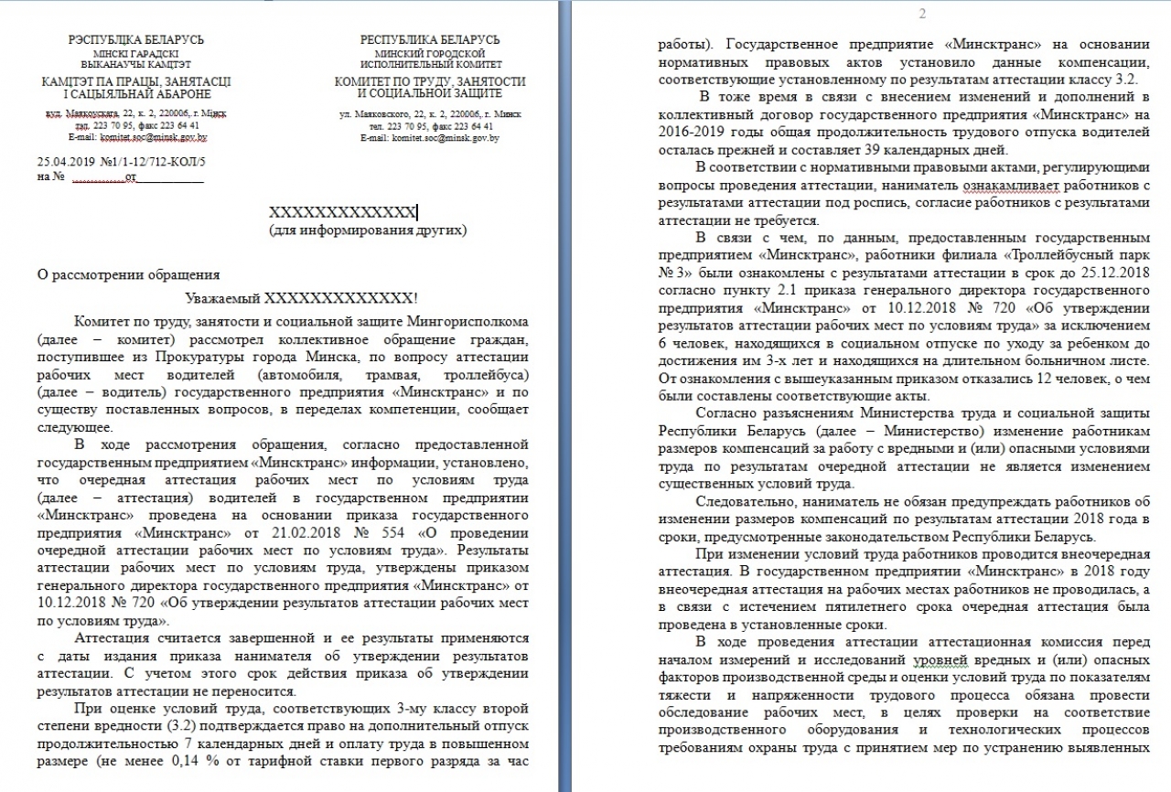 В результате получения администрацией ГП «Минсктранс» списка заявителей, по нашим данным, некоторые из подписавшихся граждан, в том числе отдельные сотрудники вышеперечисленных троллейбусных и автобусных парков, преследуются за критику (ст. 197 УК Республики Беларусь) со стороны должностных лиц филиалов ГП «Минсктранс».