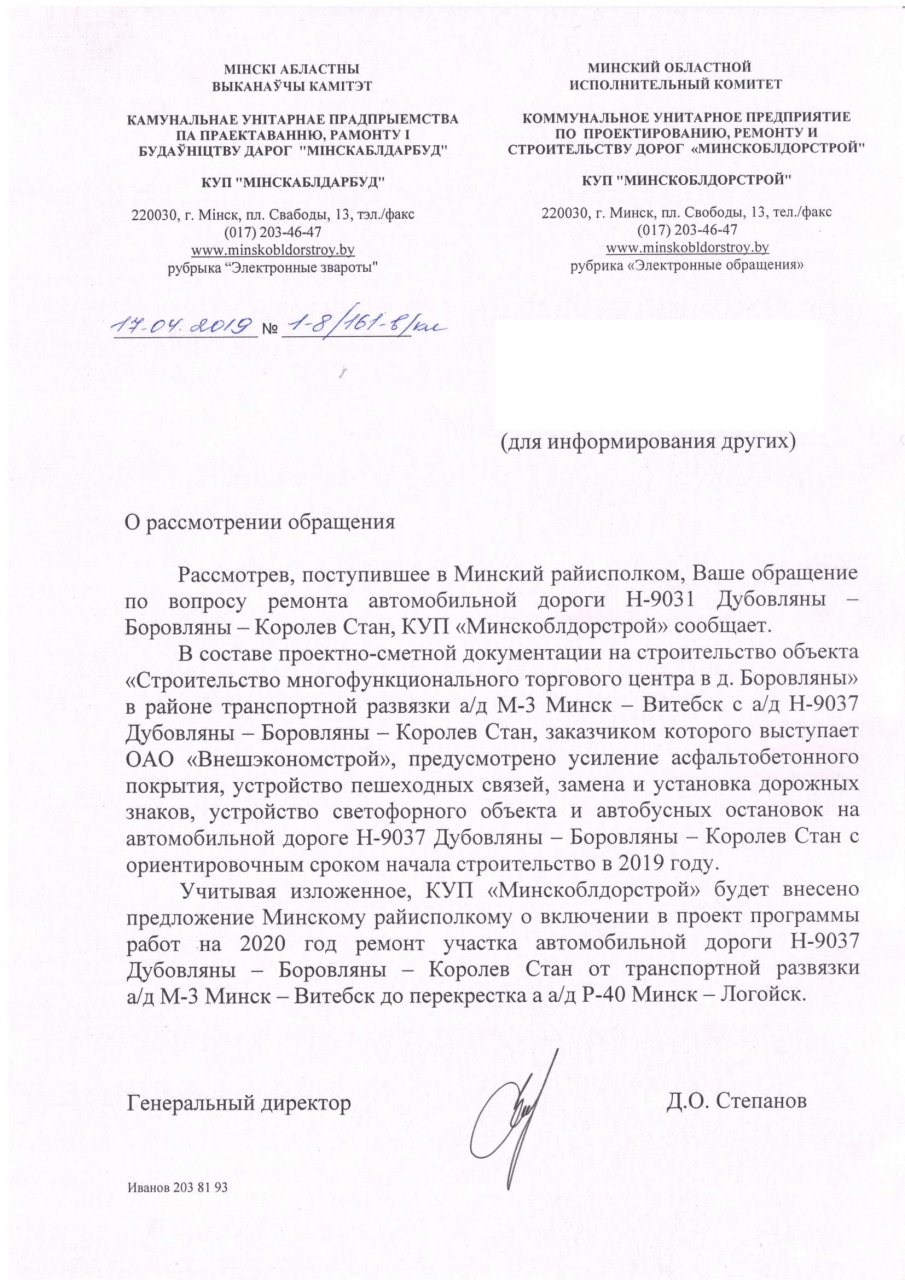 КУП "Минскоблдорстрой" будет внесено предложение о включении в проект программы работ на 2020 г. ремонта участка автодороги H-9037
