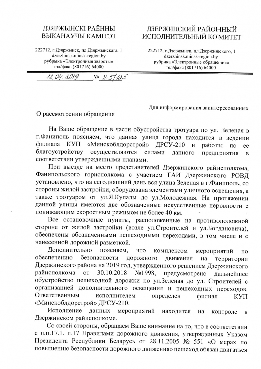 Из Северного посёлка в тёмное время суток ходят пешком по проезжей части дети, которые направляются на общественном транспорте в школу, также люди добираются общественным транспортом на работу, утром и вечером в тёмное время суток. На основании ст. 41 Закона «О местном управлении и самоуправлении», которая устанавливает, что исполкомы организуют работу по благоустройству, обеспечению надлежащего санитарного состояния территорий населенных пунктов, требуем организовать тротуар вдоль всей ул. Зелёная в г.Фаниполь, а также обозначить пешеходные переходы к остановочным пунктам.