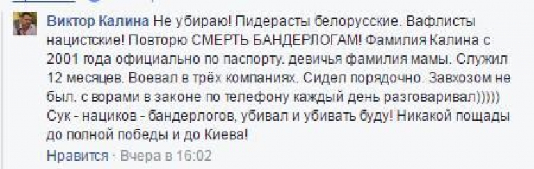 "Калина Виктор Владимирович, имея опыт военных действий в составе иррегулярных бандформирований, действующих на Юго-востоке Украины. В частности, шансонье выступает в российской военной форме с наградами «ДНР» на груди. Следует отметить, что в ходе боевых действий Калина Виктор Владимирович проявлял крайнюю жестокость по отношению к военнопленным солдатам и офицерам ВСУ, отрубая им уши саперной лопатой, о чем с гордостью говорил лично, при этом выражая намерение применять подобную практику в отношении граждан Республики Беларусь с отличной от его гражданской позицией.