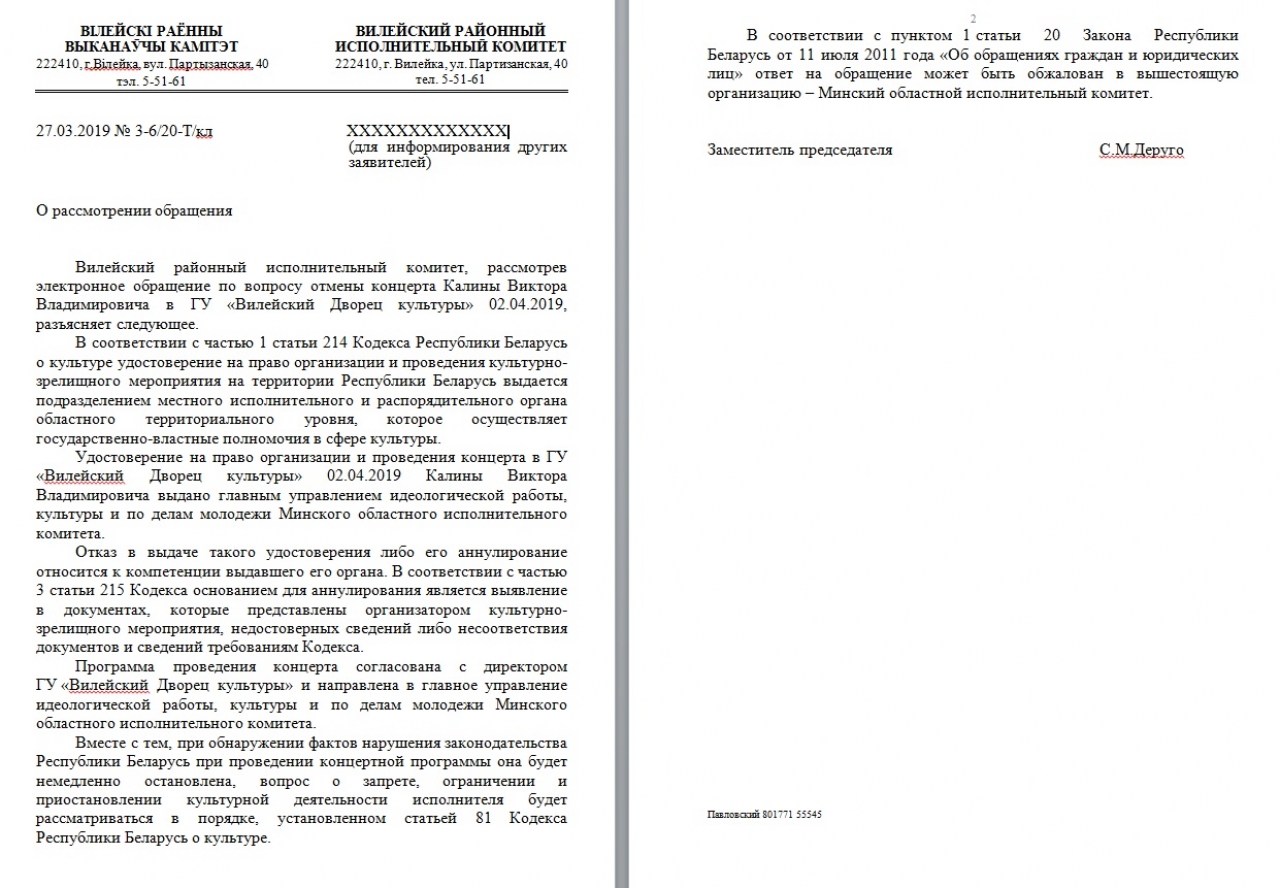 Просим принять меры по недопущению проведения концерта музыкального исполнителя Калины В.В., планируемого 2 апреля 2019 года в 18:00 в Вилейском Дворце культуры.