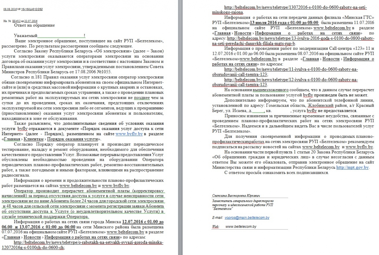 Информация о времени и продолжительности планово-профилактических работ была своевременно размещена на сайтах www.beltelecom.by и www.byfly.by.