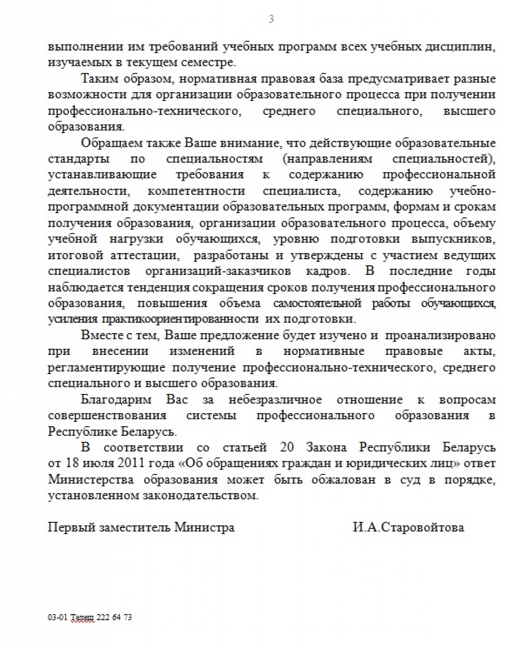 В настоящее время завершается разработка законопроекта, которым предусматривается внесение изменений и дополнений в Кодекс Республики Беларусь об образовании. Изложенные в обращении предложения будут рассмотрены в рамках работы над указанным проектом.