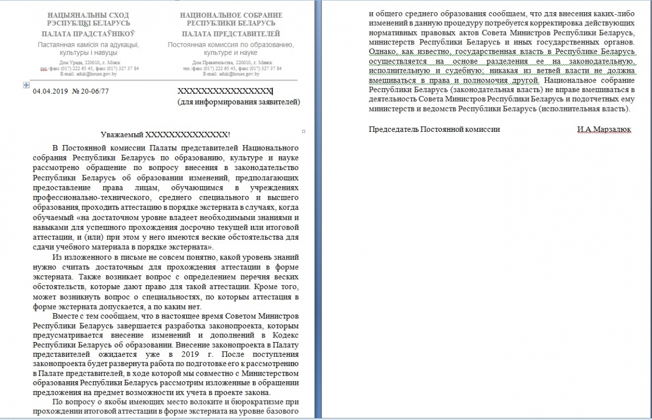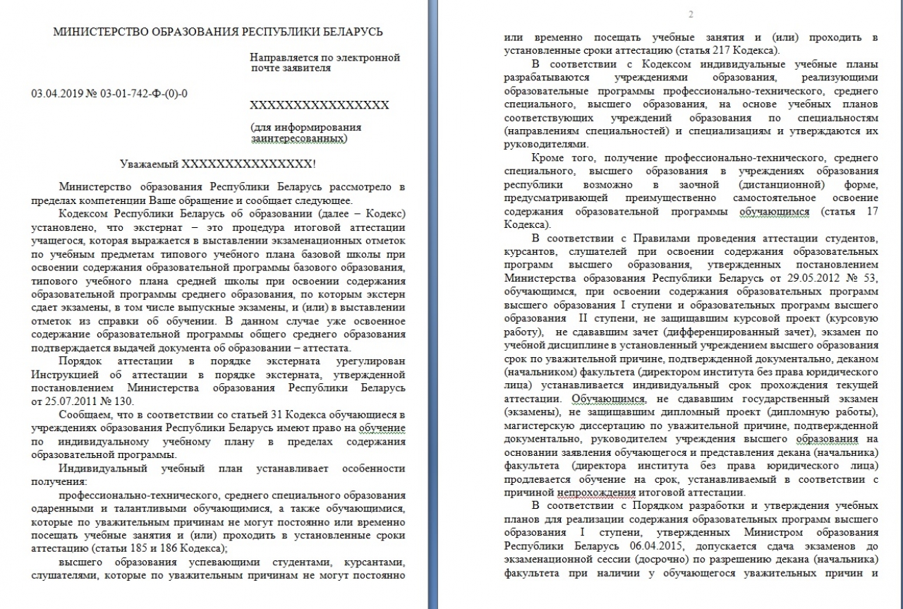 2. А так же, просим учесть, что аттестация в форме экстерната, предусматривающая алгоритм, при котором "решение о допуске к аттестации в порядке экстерната принимается отделом образования, спорта и туризма местного исполнительного и распорядительного органа по месту жительства (месту пребывания) лица на основании его заявления (заявления законного представителя несовершеннолетнего), которое необходимо подать в апреле (до 25 апреля) года аттестации в порядке экстерната" как это предусмотрено в школах, является достаточно сложной, и это создаёт излишнюю волокиту и бюрократизм.
