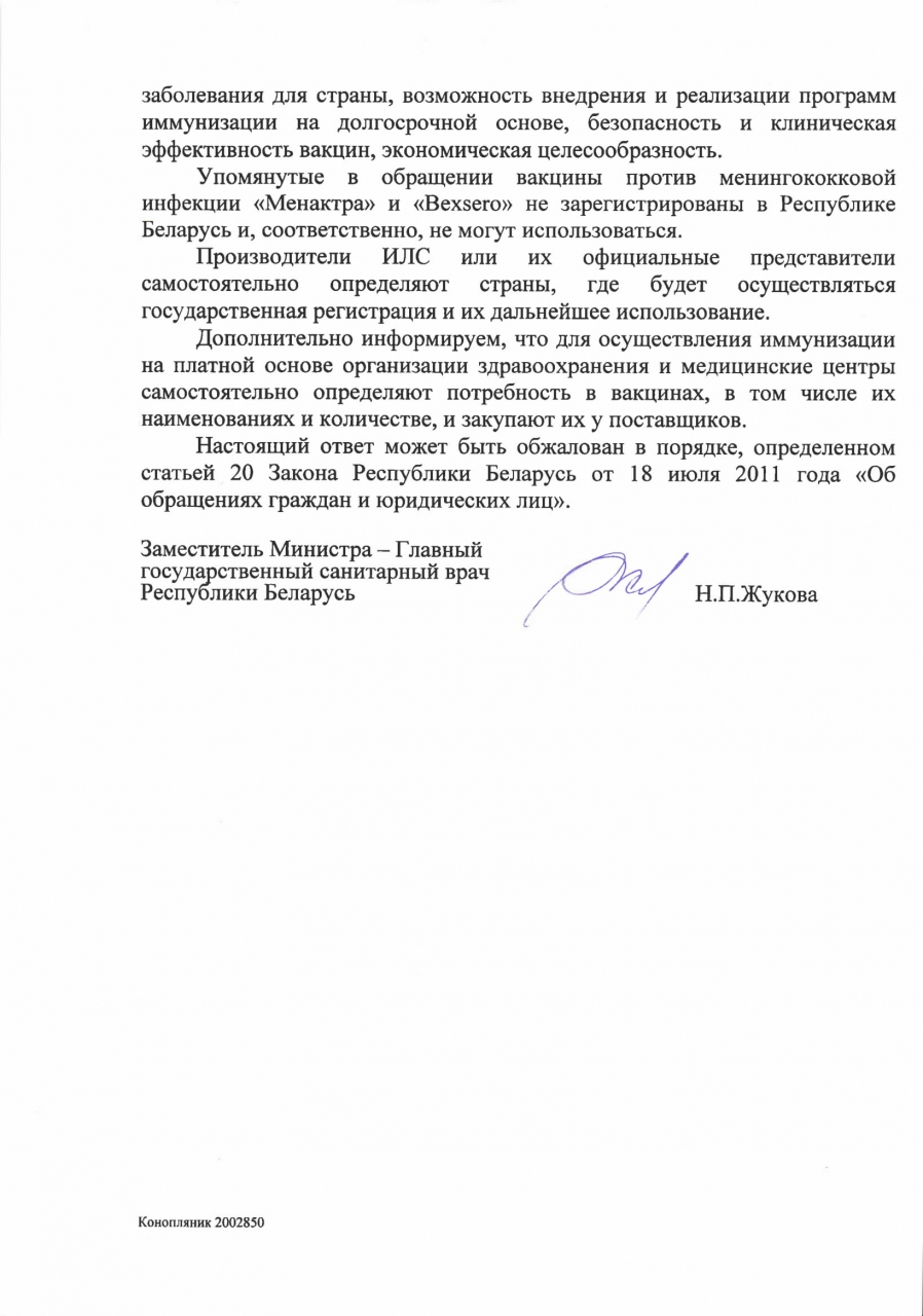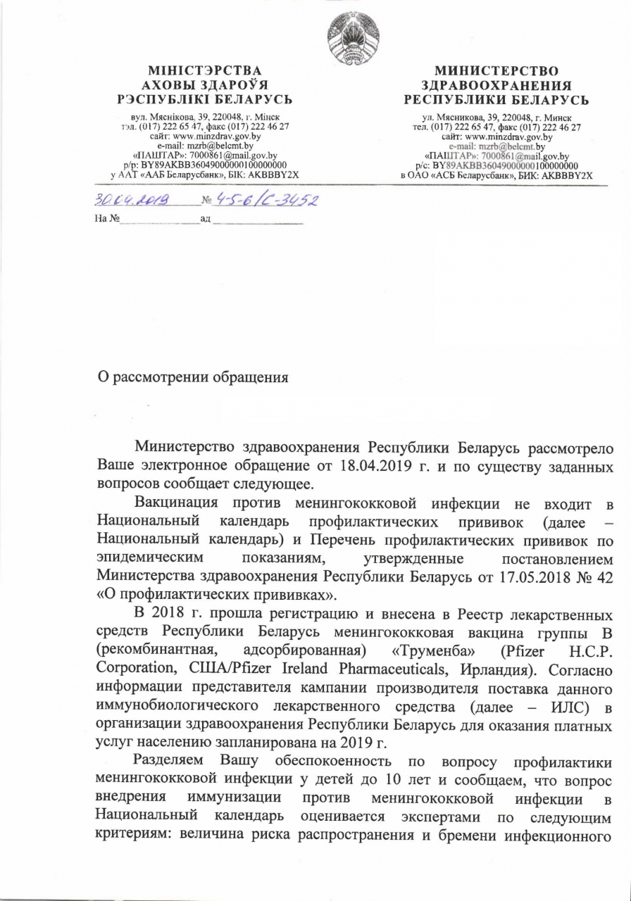 В связи с периодическими случаями гибели детей от менингита в Республике Беларусь и невозможностью вакцинации от менингококковой инфекции в нашей стране, на основании Положения о Министерстве здравоохранения, утвержденного Постановлением Совета Министров Республики Беларусь от 28.10.2011 N 1446, которым установлено, что Минздрав определяет порядок и условия применения методов оказания медицинской помощи, просим принять меры для защиты здоровья и жизни наших детей от менингита и обеспечить возможность прививки хотя бы на платной основе следующими вакцинами: