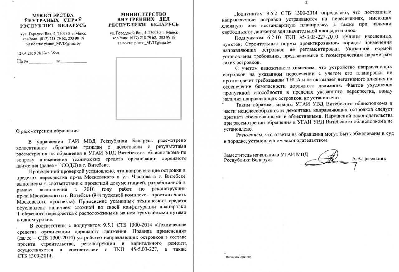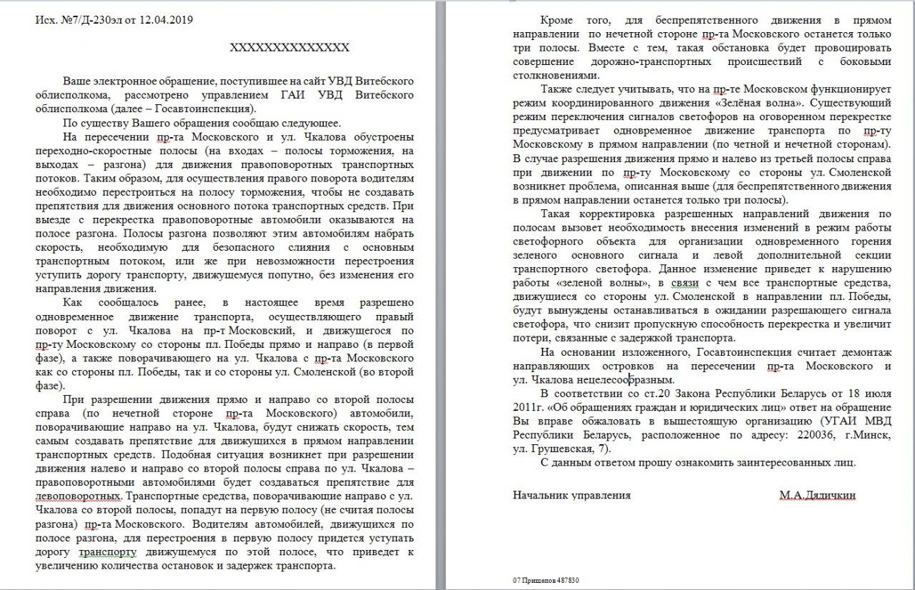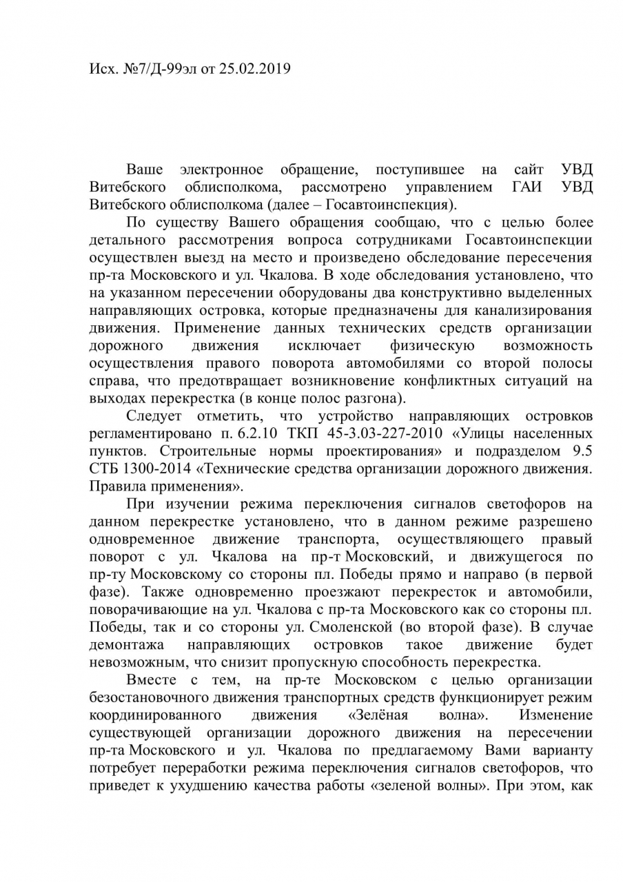 В свою очередь приведем примеры, где схожие по конструкции перекрестки в г.Витебске (предполагаем, что таких насчитывается много по Республике Беларусь) эффективно работают без применения направляющих островков. Это перекресток ул. Терешковой и пр-т Фрунзе, перекресток пр-т Строителей и пр-т Черняховского.