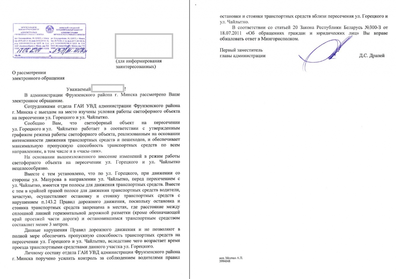Мы, нижеподписавшиеся, просим обратить внимание на регулирование движения светофором, расположенным на перекрёстке улиц Горецкого и Чайлытко в городе Минске.