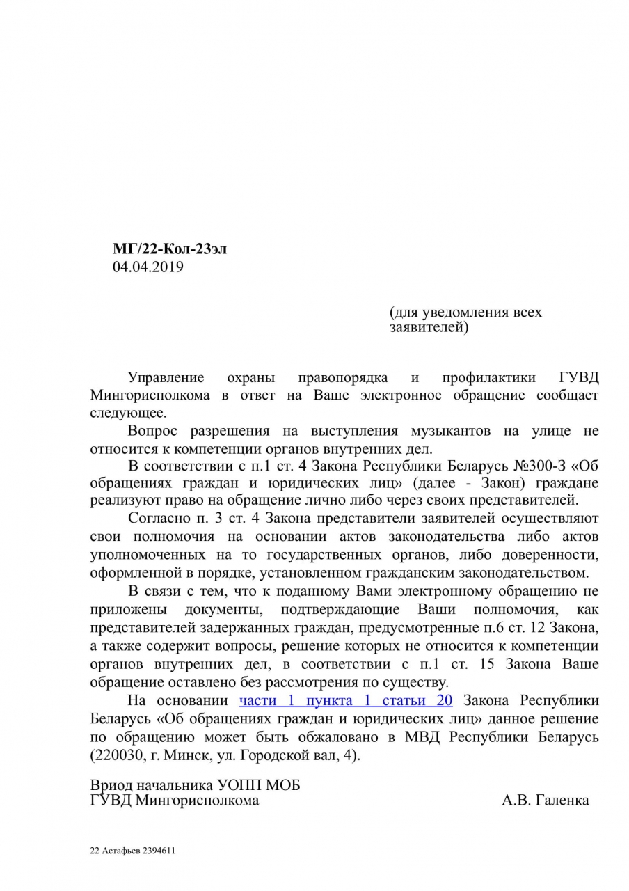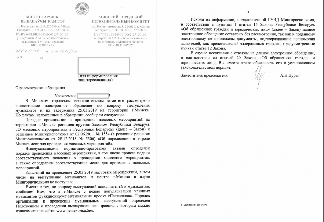 Председателю Мингорисполкома, Анатолию Сиваку вопрос: почему в Беларуси, стране в центре Европы, на пешеходной улице, в которую были вложены миллионы рублей во время реконструкции - запрещено играть уличным музыкантам? Впереди 2 Европейские игры, на которые приедут гости из многих стран, в которых есть такая традиция. Что мы им хотим показать? Пустую улицу с гранитной плиткой и 623 столбика?