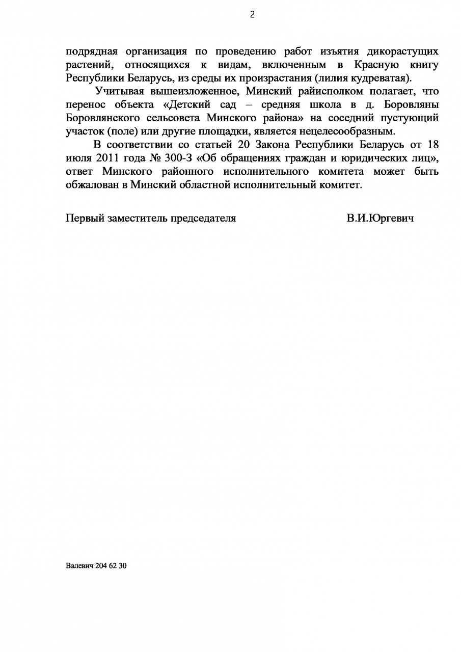 3. По имеющимся у нас данным, более 6500 жителей Боровлянского сельского Совета, не согласны с планами местных органов власти по ликвидации ландшафтно-рекреационной зоны c уникальной экосистемой в д. Боровляны. Построить школы и сады можно без вырубки леса на других площадках, согласно «Генеральному плану д. Боровляны и аг. Лесной Боровлянского сельсовета Минского района». Цена строительства при этом будет обычной и срок порядка 1 года.