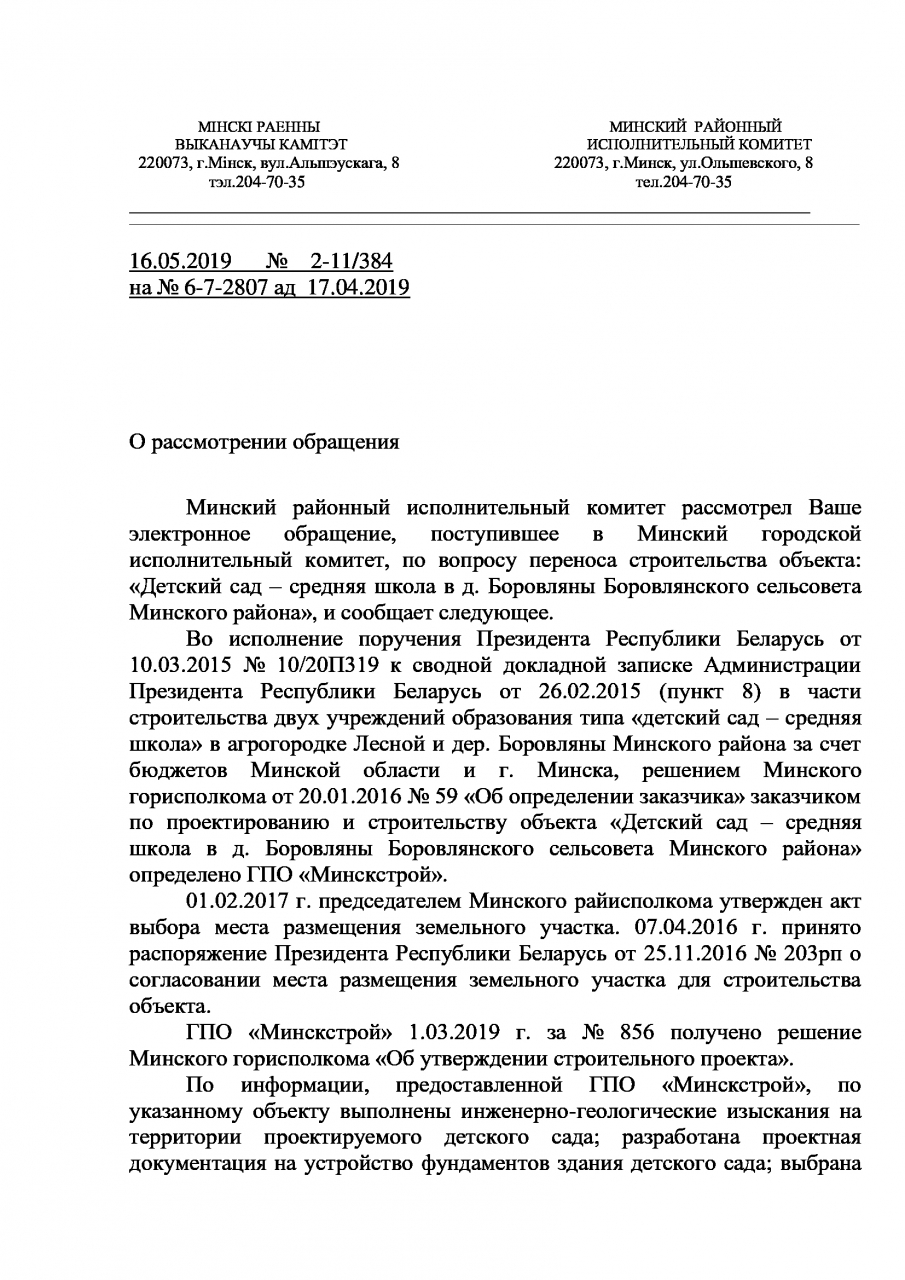 2. Минским городским исполкомом выделены деньги на строительство сада и школы в д. Боровляны. Но Минский районный исполком с 2017 года по нашим сведениям пытается «освоить» эти деньги самым расточительным для страны способом – построить соц.объекты на месте 4,8 га леса, в котором произрастают охраняемых видов флоры и фауны, занесенные в Красную Книгу Республики Беларусь. Рядом с этим лесом находятся «SOS-Детская деревня Боровляны» и Республиканский научно-практический центр детской онкологии, гематологии и иммунологии. Само строительство более чем в два раза дороже обычного, и в три раза дольше (строительство предполагается в три очереди).