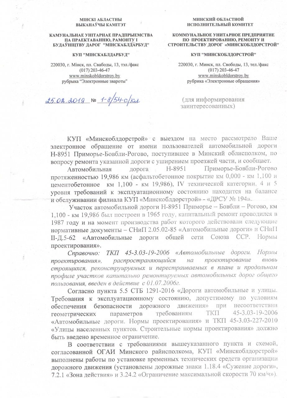На основании ст. 41 Закона «О местном управлении и самоуправлении», которая устанавливает, что исполкомы организуют строительство, реконструкцию, ремонт и содержание местных автомобильных дорог, управляют дорожной деятельностью, просим облисполком выступить заказчиком по реконструкции дороги Н8951.