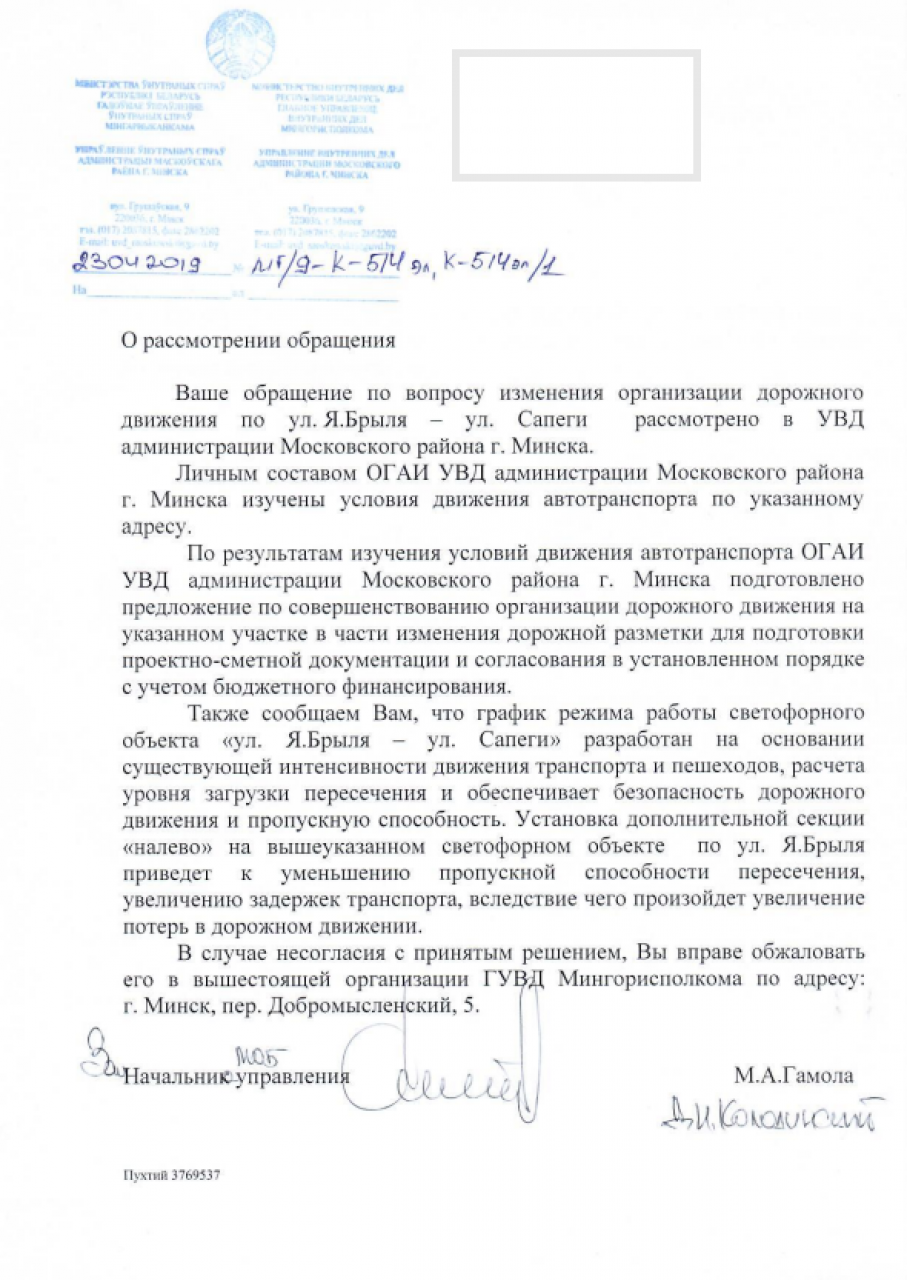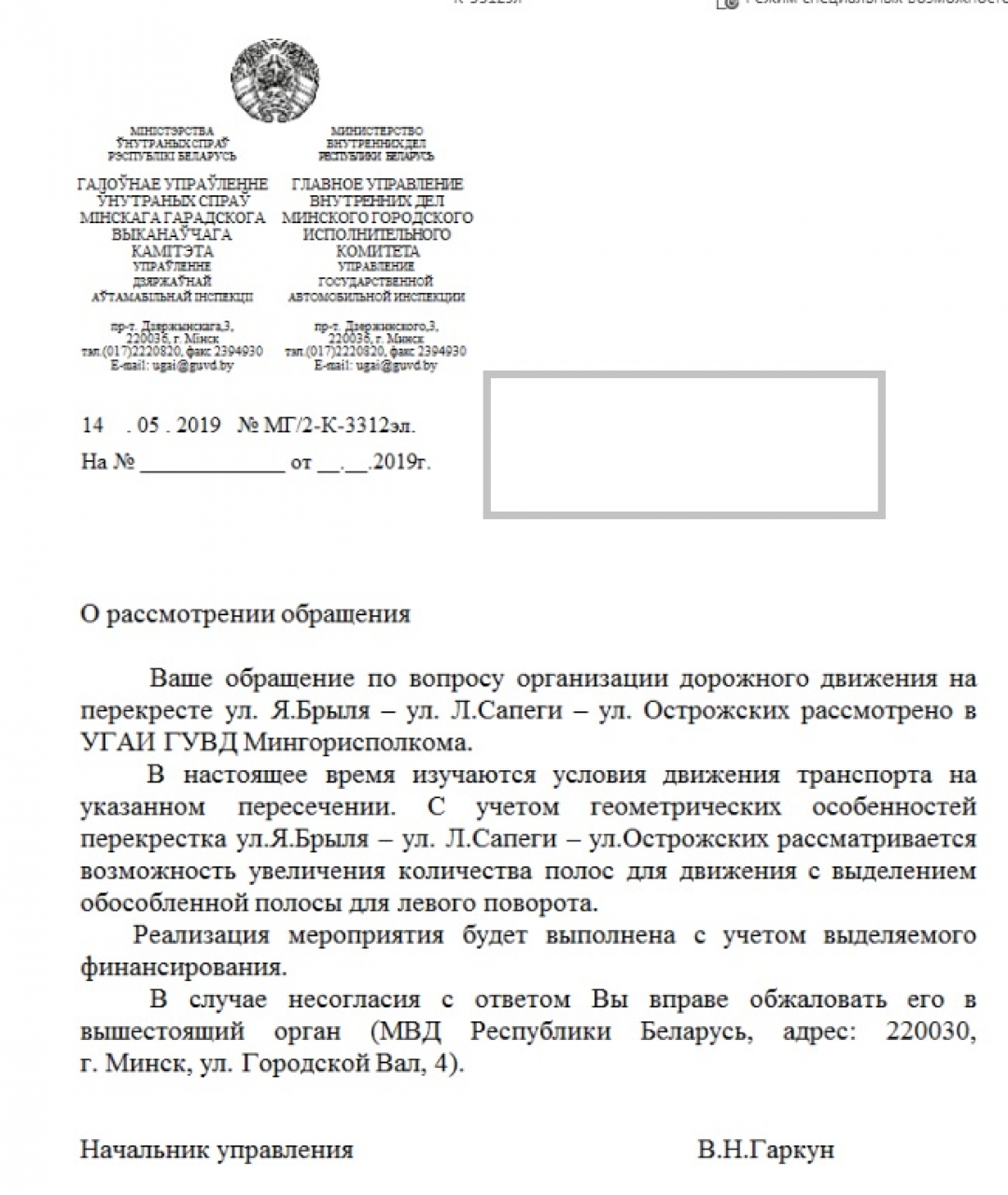На основании ст. 41 Закона «О местном управлении и самоуправлении», которая устанавливает, что исполкомы организуют строительство, реконструкцию, ремонт и содержание местных автомобильных дорог, управляют дорожной деятельностью, просим реконструировать перекресток улиц Янки Брыля, Льва Сапеги и Острожских, добавив дополнительные полосы левого поворота с улицы Янки Брыля на улицу Льва Сапеги и с улицы Янки Брыля на улицу Острожских.